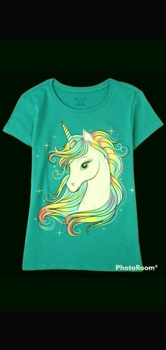 CHILDRENS PLACE pamučna majica vel.14 (152), novo s etiketom. Preslatka pamučna majica zelene boje sa predivnom aplikacijom jednorogom s prednje strane.