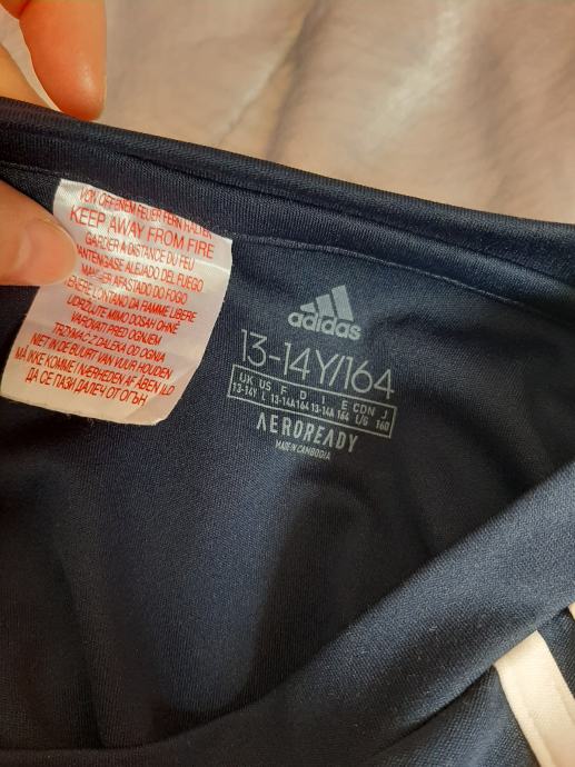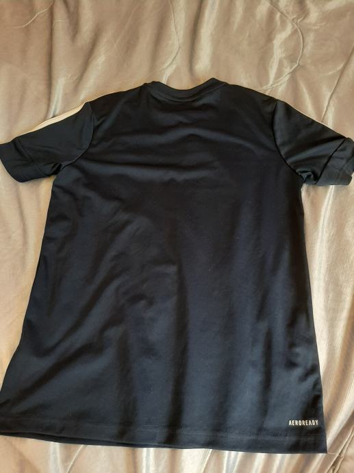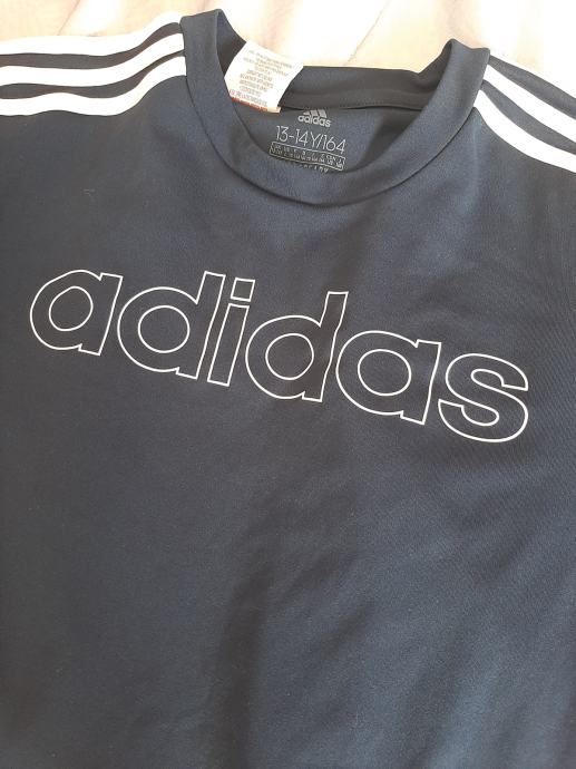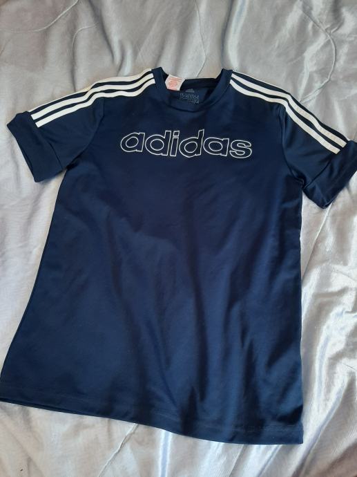 Tamnoplava dječja majica kratkih rukava Adidas. Nošena svega par puta, kao nova. Vel. 158-164. Dužina od vrha ramena do dolje 64, širina od pazuha do pazuha 48cm
