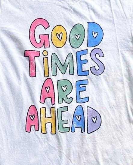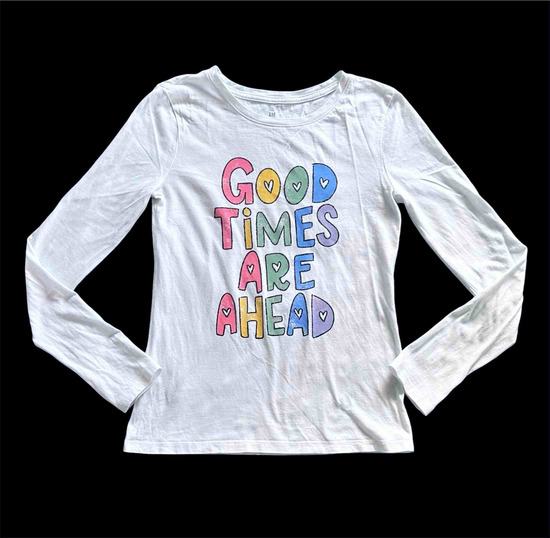 GAP preslatka pamučna majica vel.158 (dječji XXL), kao nova. Preslatka majica s šljokastom aplikacijom natpisa GOOD TIMES ARE AHEAD s prednje strane, obučena možda 2 puta, kao nova. Kupljena u USA, plaćena preko 20 usd.
