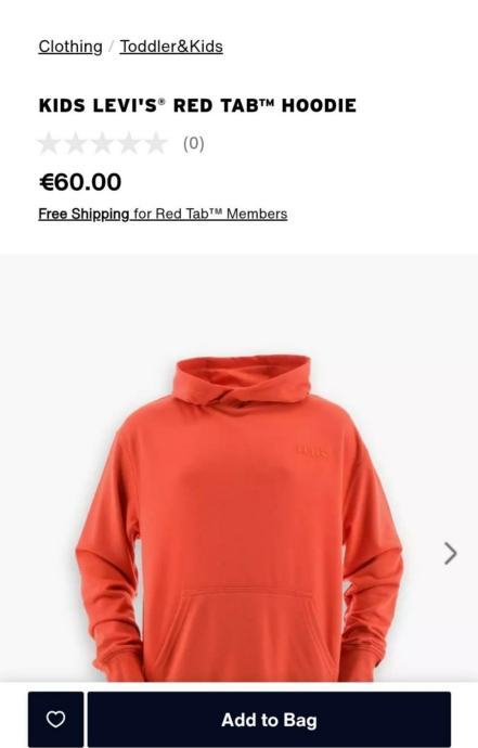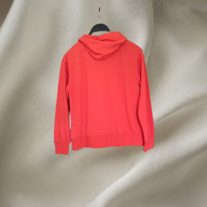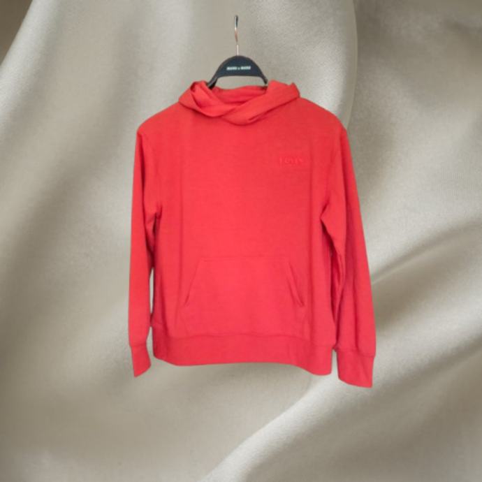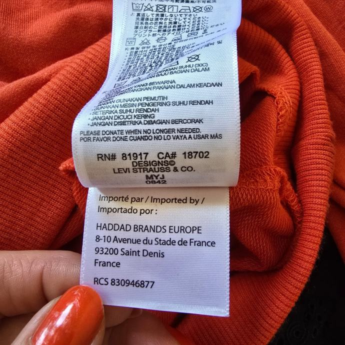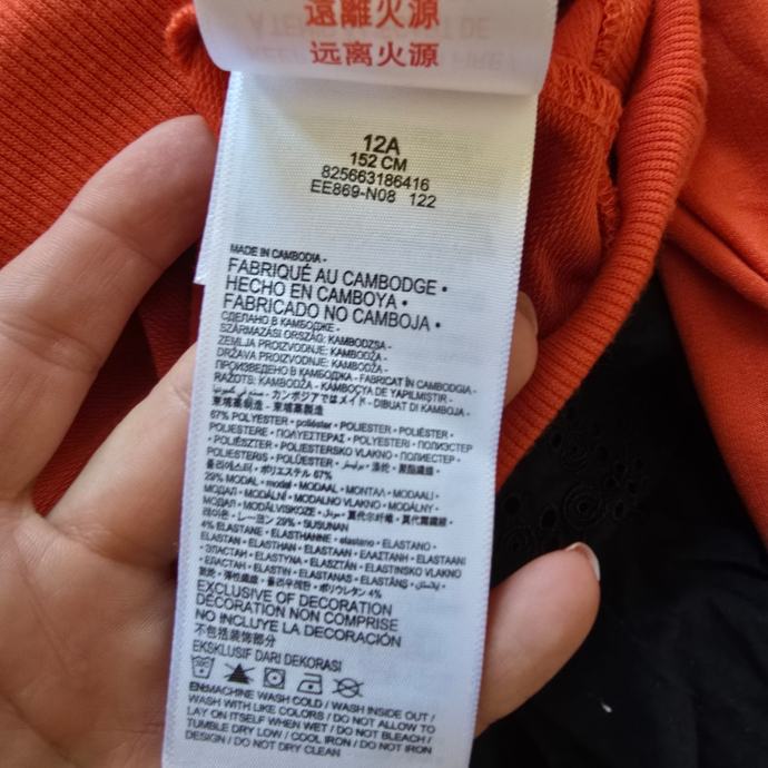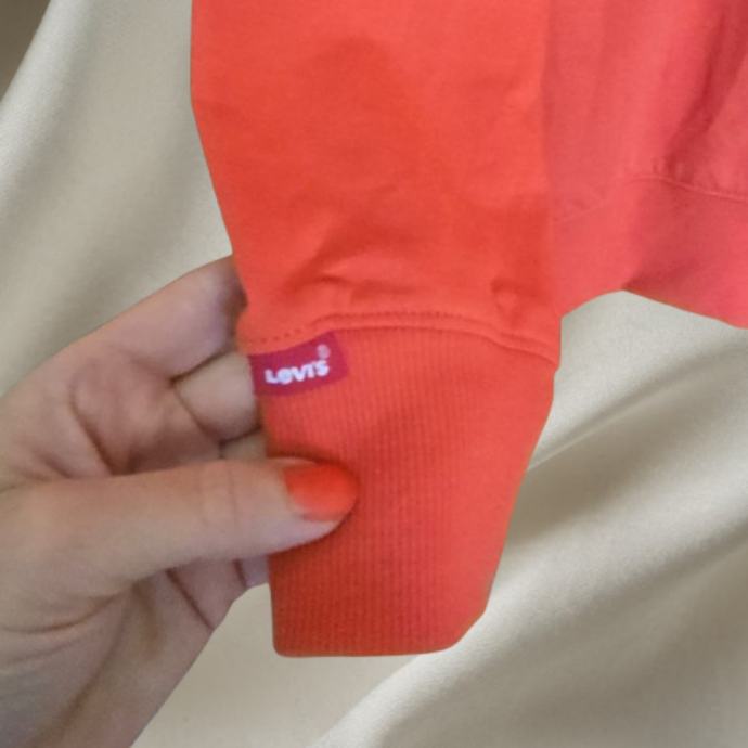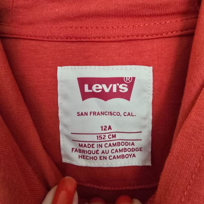 Unisex dječja narančasta Levis majica veličina 12 godina za 152 cm. Mjere su ramena 47 cm, prsa 47 cm, rukavi 54 cm, dužina 59 cm. Sastav je 67% poliester, 29% modal, 4% elastin. Majica je plaćena 60 EUR.