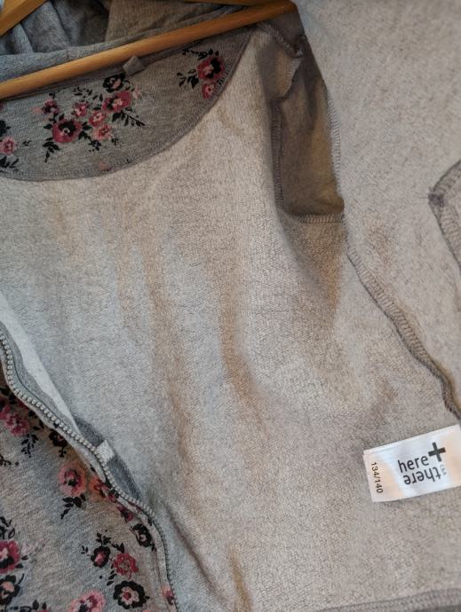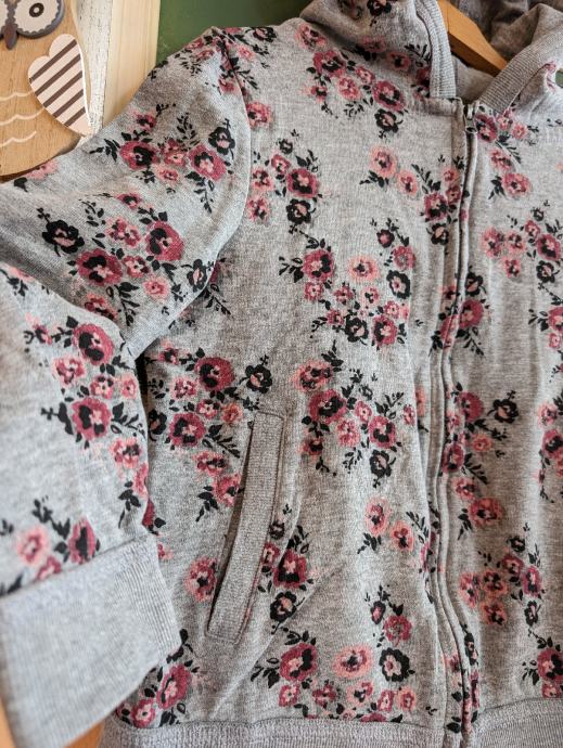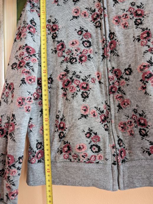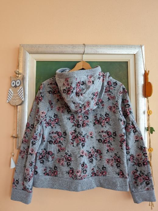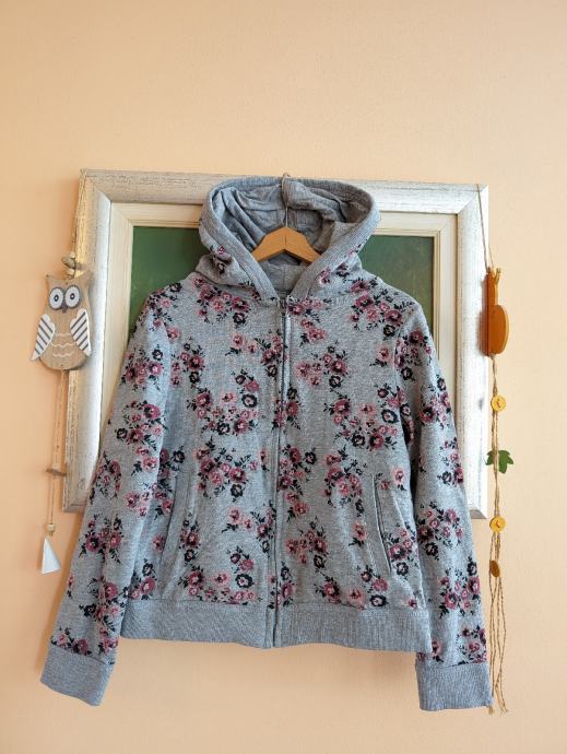 Majica na kopčanje s kapuljačom / duksa br. 134, pretežno sive boje, s motivima cvjetića, kopčanje na cif, sa dva džepa naprijed, topla, mekana i udobna jaknica, nošena, očuvana, stanje vidljivo na slikama.