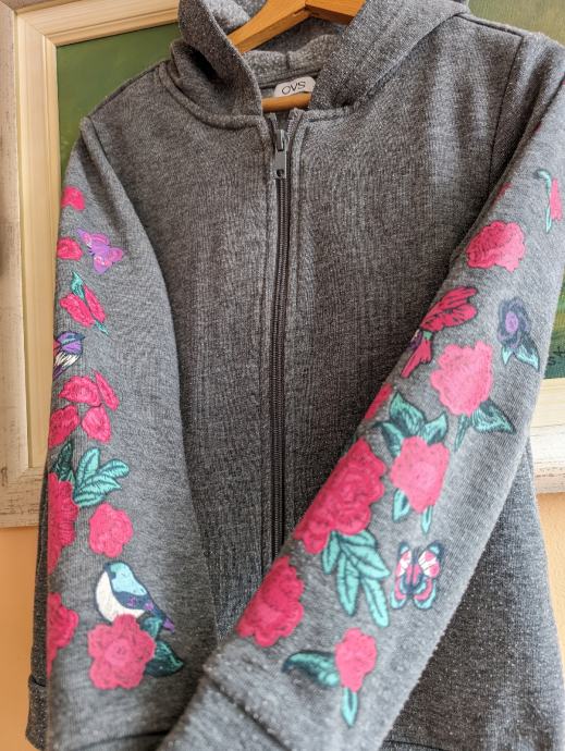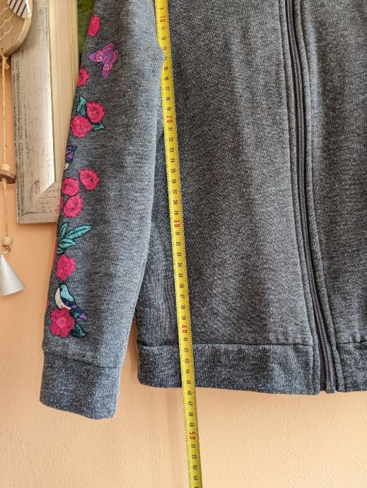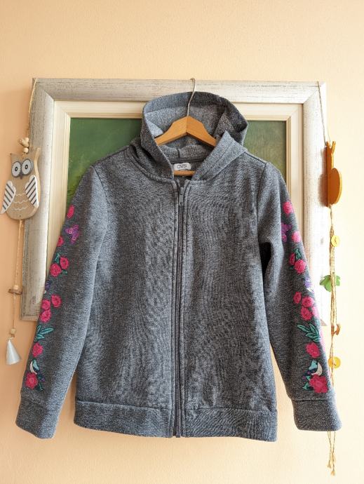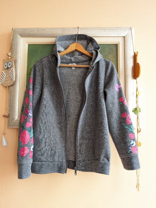 Majica na kopčanje s kapuljačom / duksa br. 122, pretežno sive boje, s motivima cvijeća na rukavima, kopčanje na cif, topla, mekana i udobna jaknica, nošena, očuvana, stanje vidljivo na slikama.