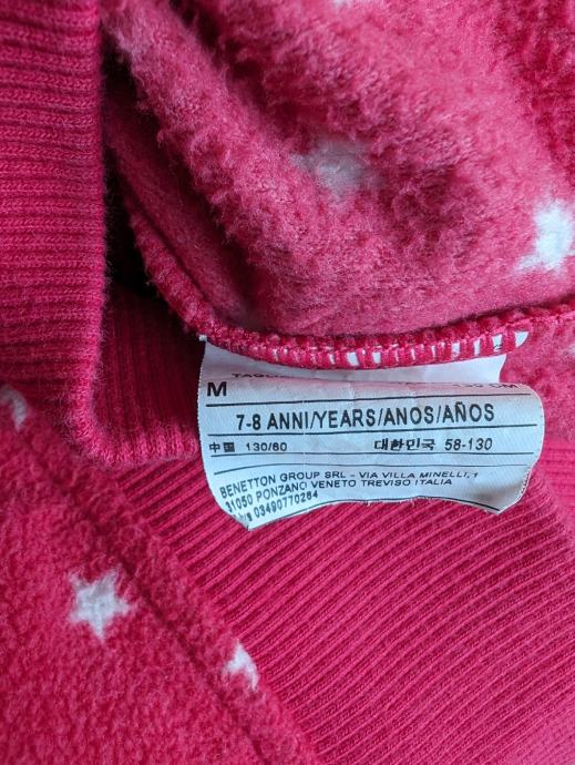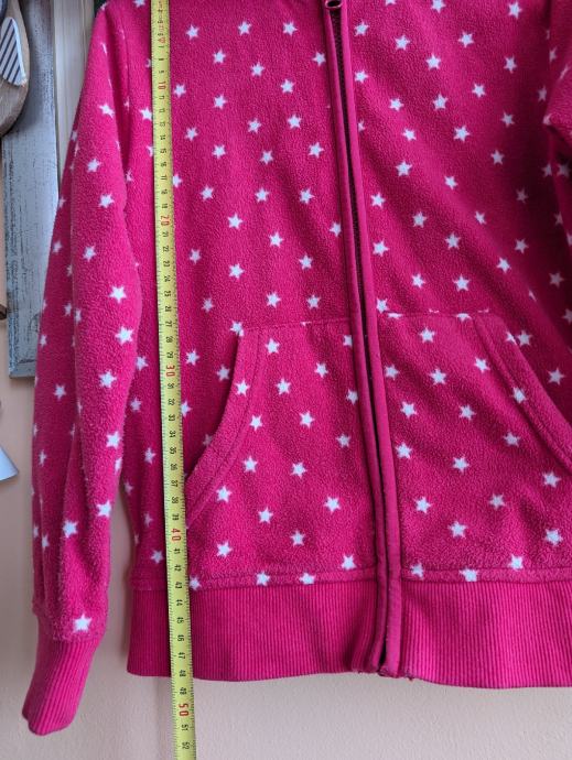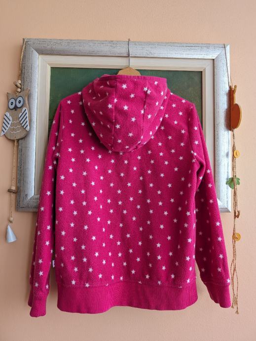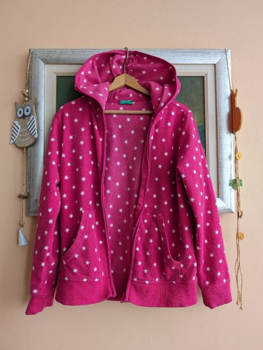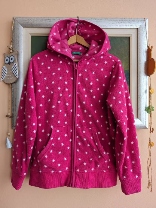 Majica na kopčanje s kapuljačom / duksa za djevojčice br. 122, marke Benetton, pretežno roze boje, s motivima zvjezdica, s dva džepa naprijed, kopčanje na cif, topla, mekana i udobna jaknica, nošena, očuvana, stanje vidljivo na slikama.