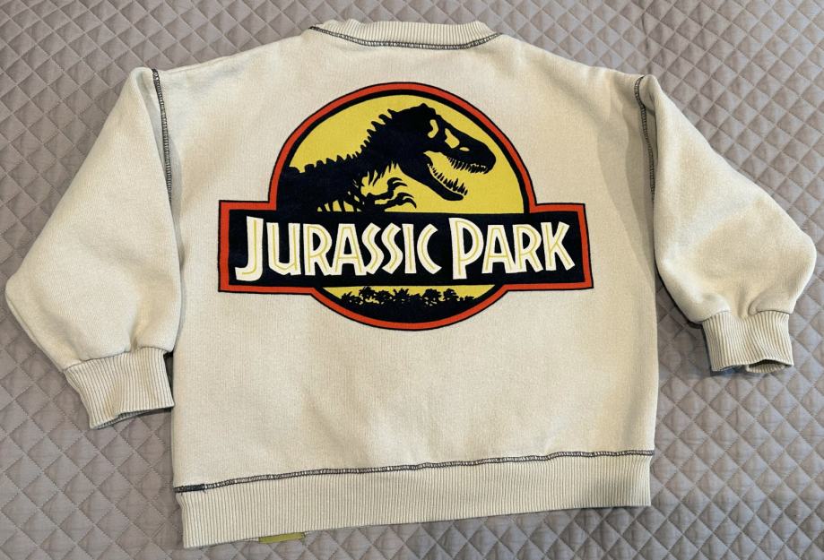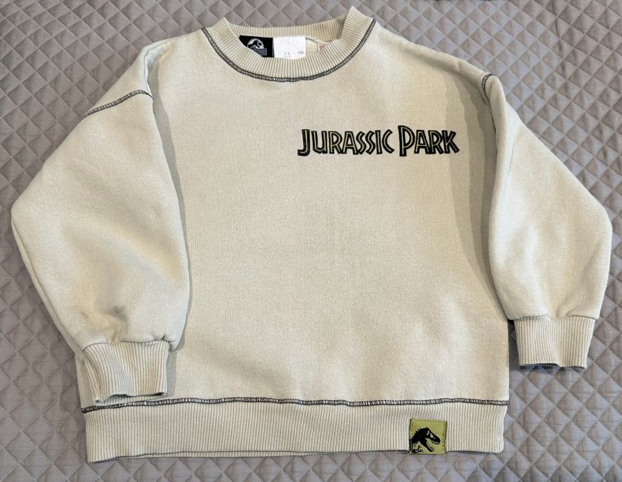Prodajem Zara dječju deblju majicu. Majica bež boje, s Jurassic Park motivom na leđima, veličina 104 (3-4 godine). Obučena samo jednom, bez vidljivih tragova nošenja.