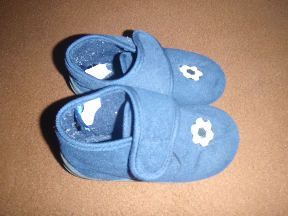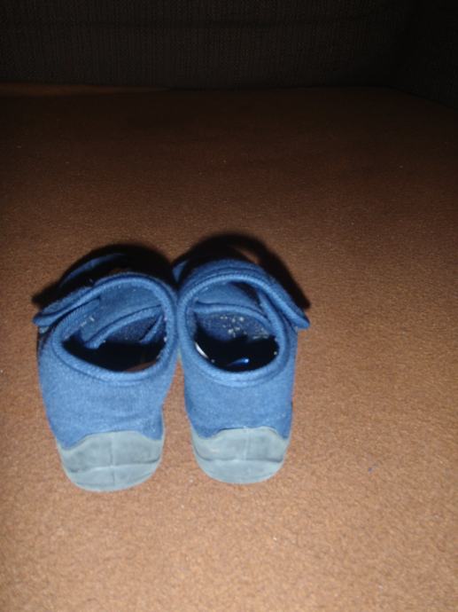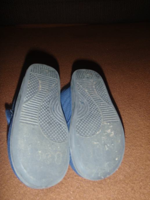 Dječje papuče tamno plave. Veličina 26. Kopčanje na čičak. Na prednjoj strani zakrpa na loptu. Dobro očuvane, bez flekica i oštećenja.