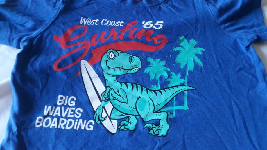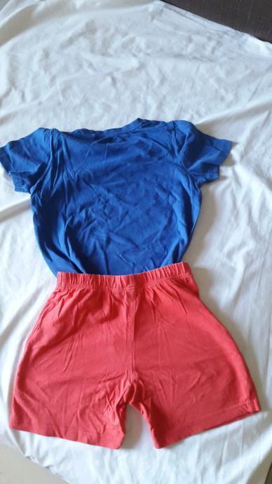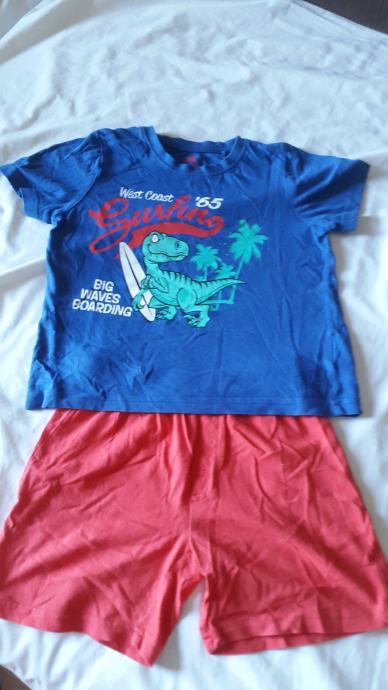 Dječja pidžama kratkih rukava. Veličina 110/116. Materijal pamuk. Kratke hlače crvene boje i majica na kratke rukave plave boje sa aplikacijom dinosaura. Bez flekica i oštećenja. Jako dobro očuvana.