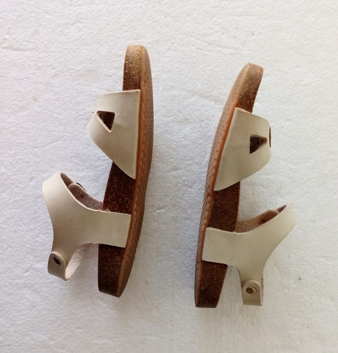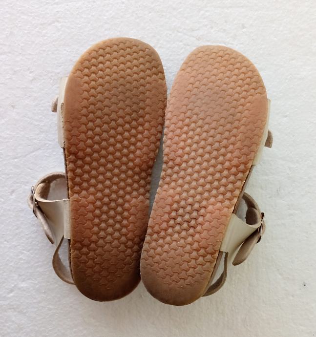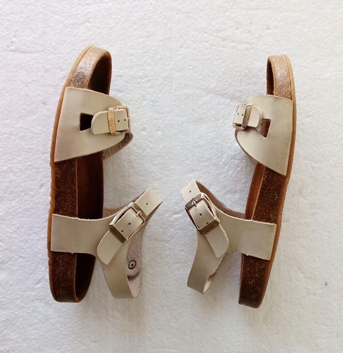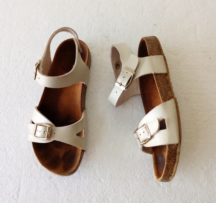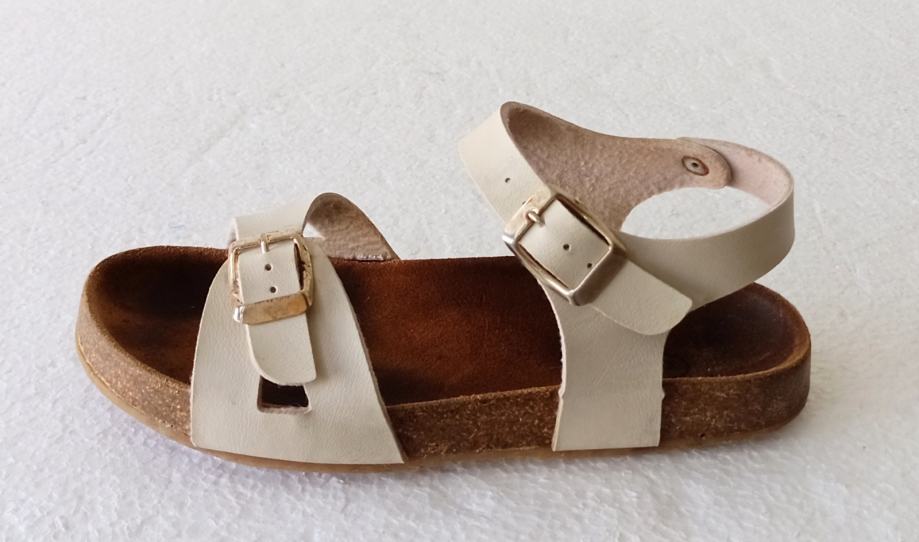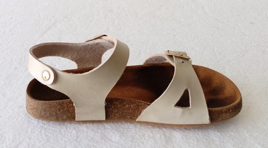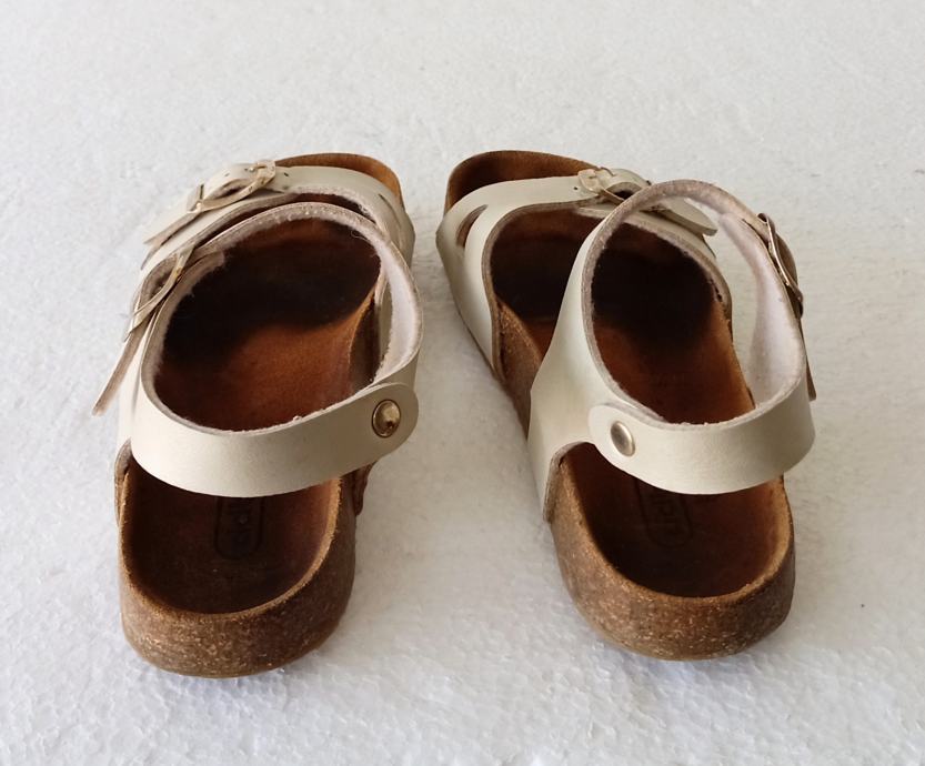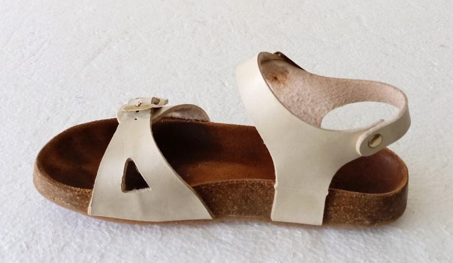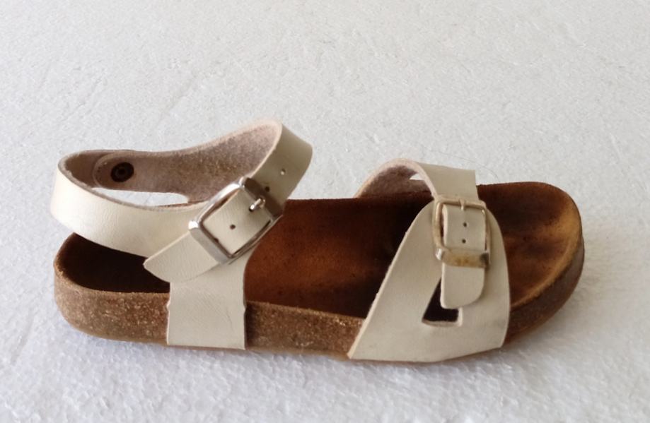 CICIBAN BIO sandale sa sedefasto krem remenčićima. Unutrašnje gazište je 21,3 cm, što odgovara veličini 34 (veličina se izbrisala). Remenčići su od umjetne kože, podloženi filcom. Anatomska tabanica. Podloga sandale je od prirodne kože i pluta, a potplati od gume. Nošene, ali u ispravnom stanju.