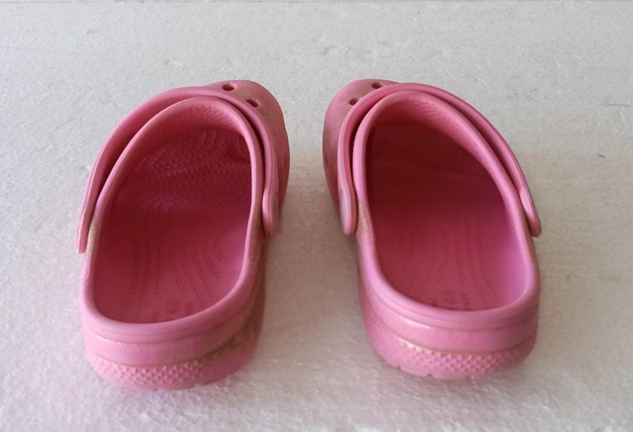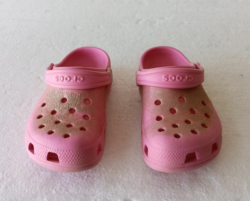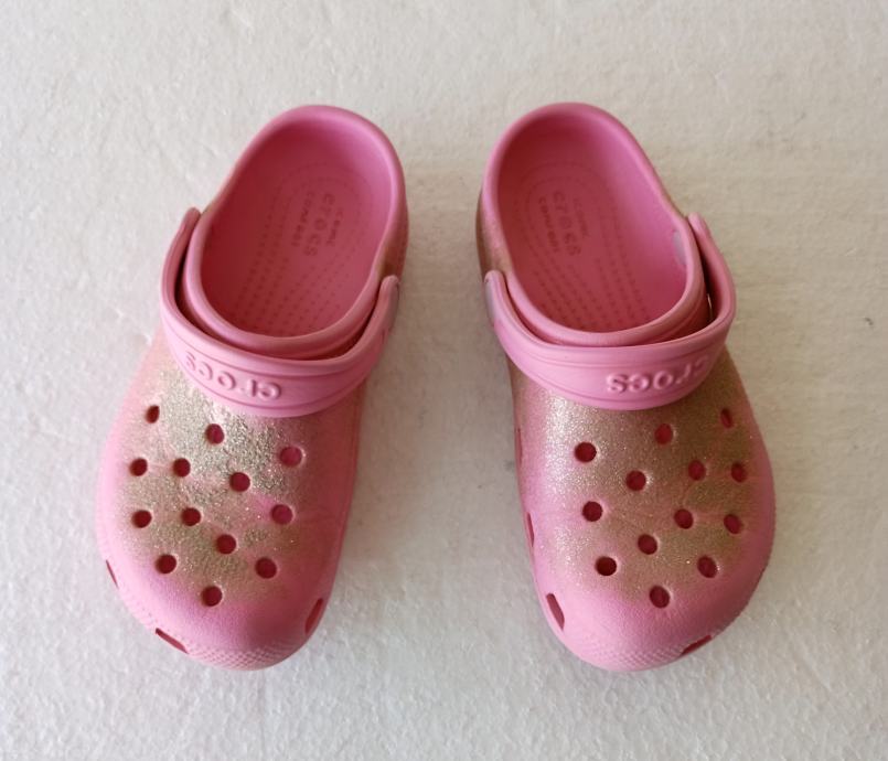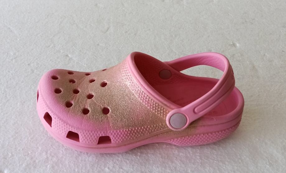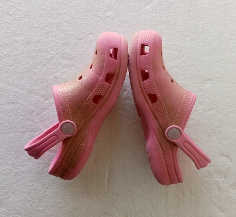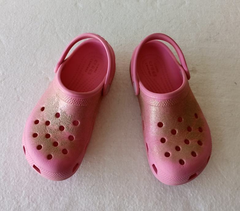 Original ICONIC CROCS COMFORT roze natikače sa zlatnim šljokicama, deklarirane veličine C13 što odgovara vel.