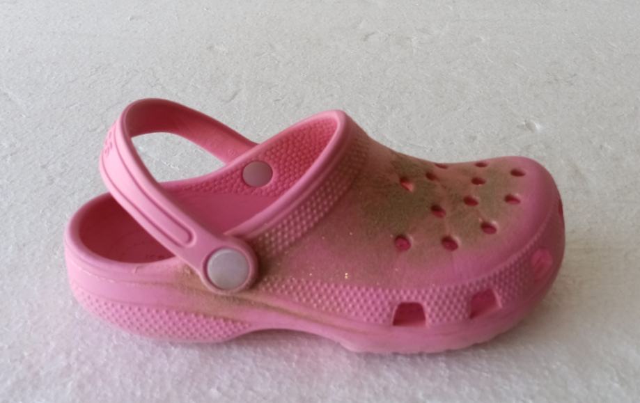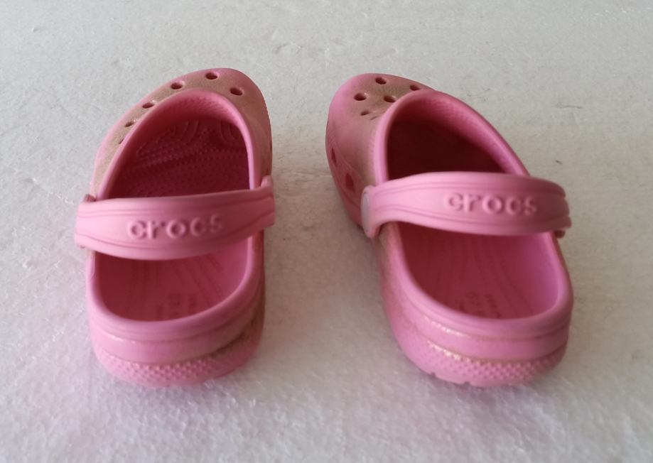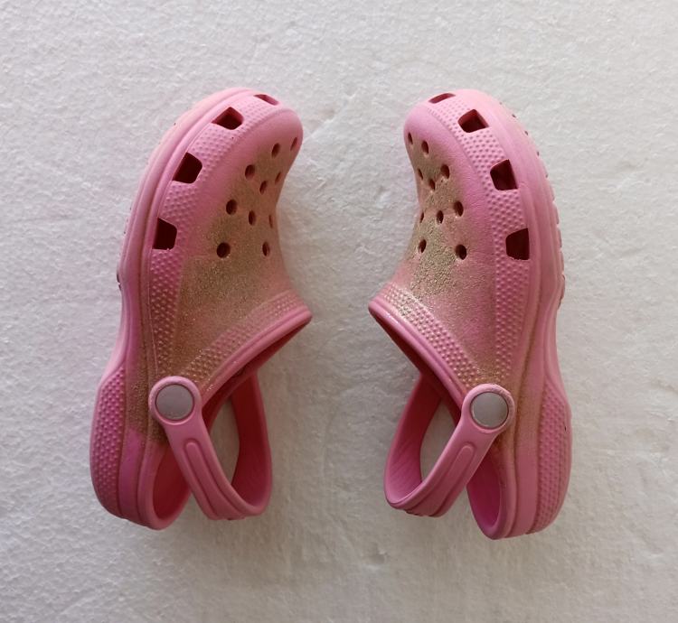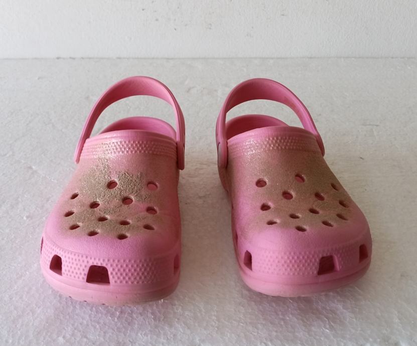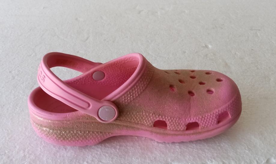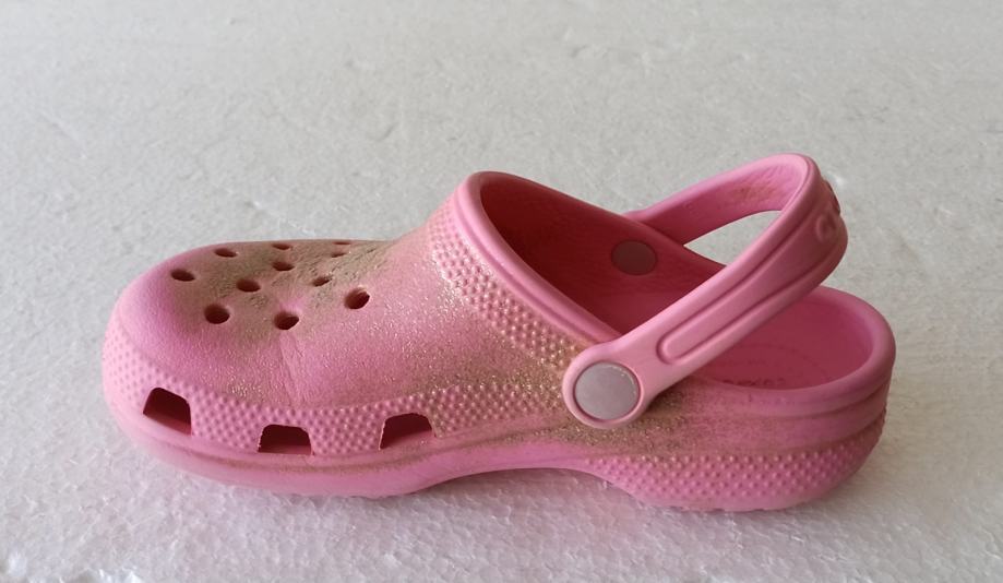 Original ICONIC CROCS COMFORT roze natikače sa zlatnim šljokicama, deklarirane veličine C13 što odgovara vel.