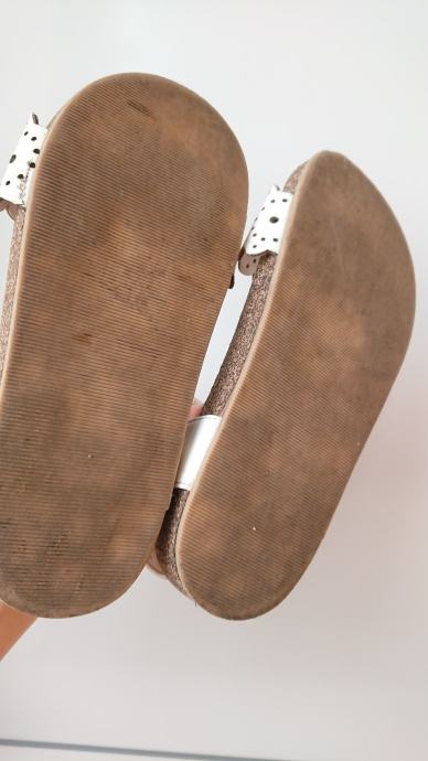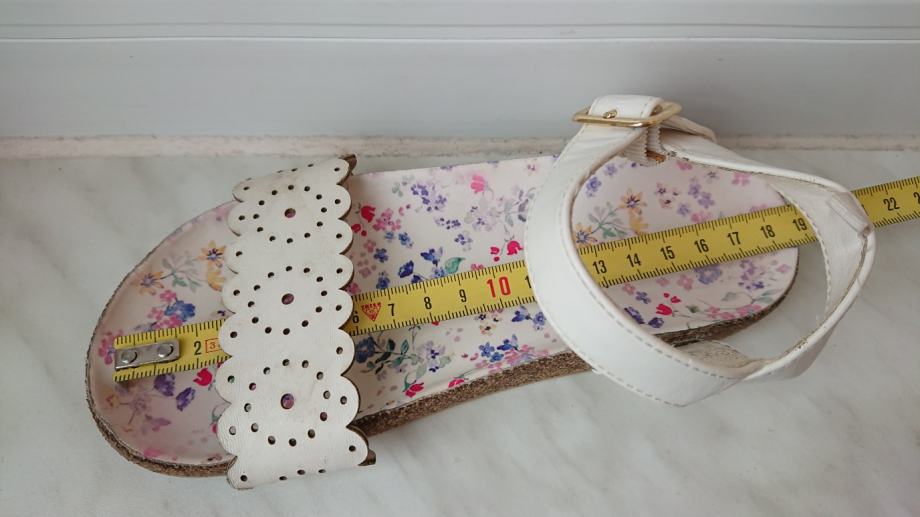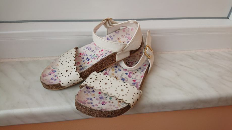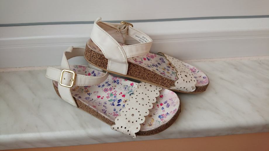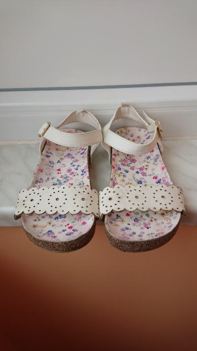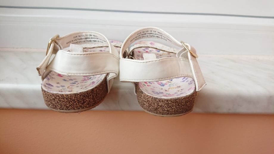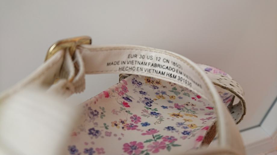 Ljetne sandale za curice br. 30, ug cca 18cm, marka H&M, pretežno bijele boje sa uzorkom cvjetića, kopčanje sa strane, nošene, stanje vidljivo na slikama.