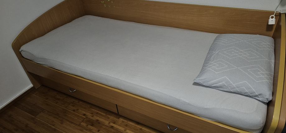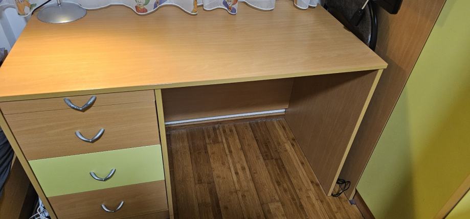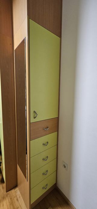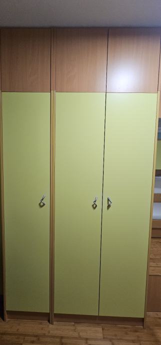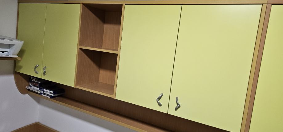 Soba je u super stanju. Ima 2 kreveta bez madraca 200x90 i 190x90 sa ladicama. 4 ormara VxŠxD 204x84x59, 204x44x59, 204x44x59, 204x44x40. Ormari imaju i nadograđeni dio od 46cm koji se može lako skinuti i staviti. Viseći ormari 95x205x30 i 95x195x30. Radni stol 120x60.