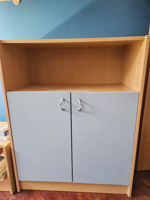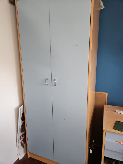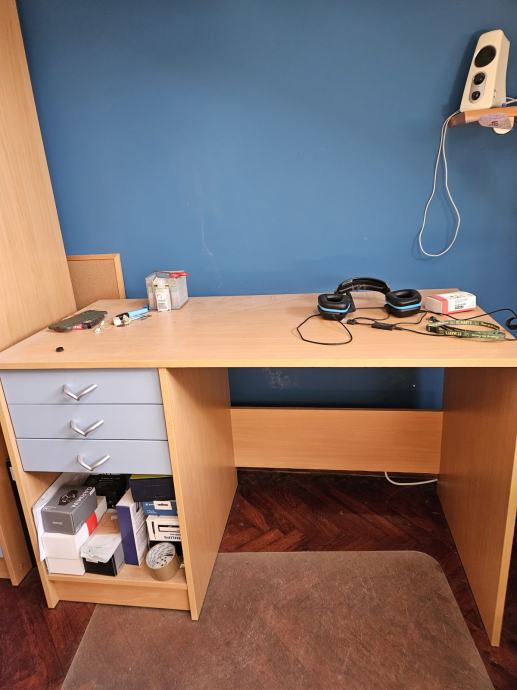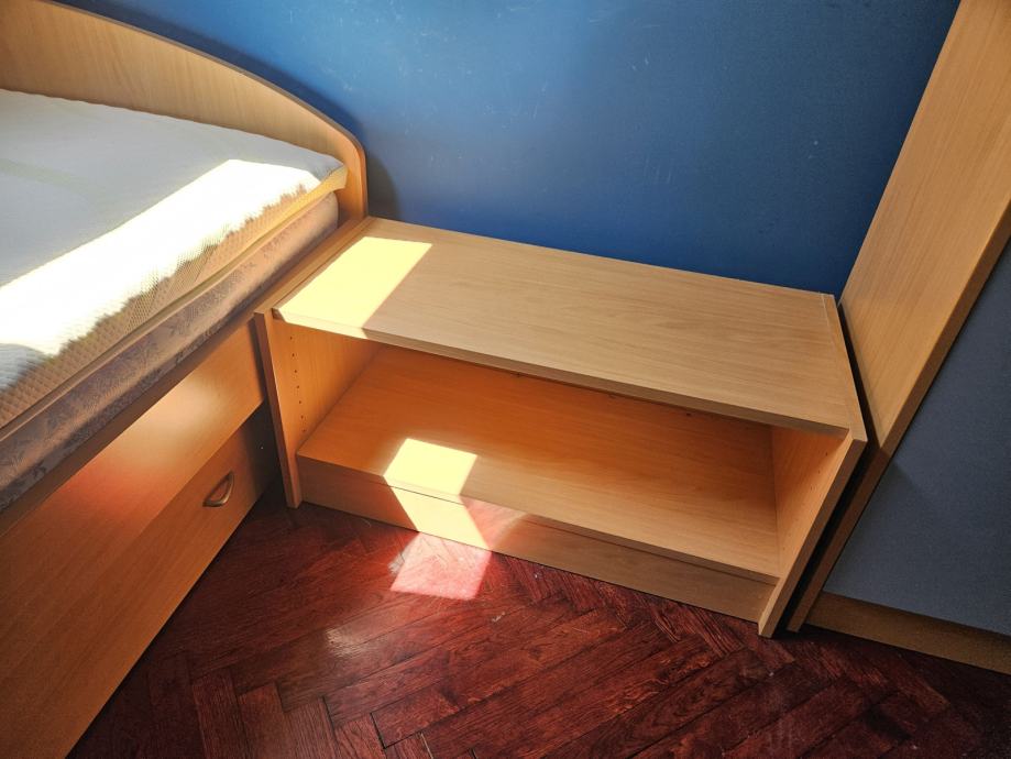 Dva ormara, dva kreveta sa ladicama za pohranu, dvije manje komode, jedan veći i jedan manji radni stol, dvije police za zid, jedne male komode bez vrata i jedne velike komode bez vrata koja je ujedno postolje za veliki radni stol. Namještaj je u dobrom stanju.