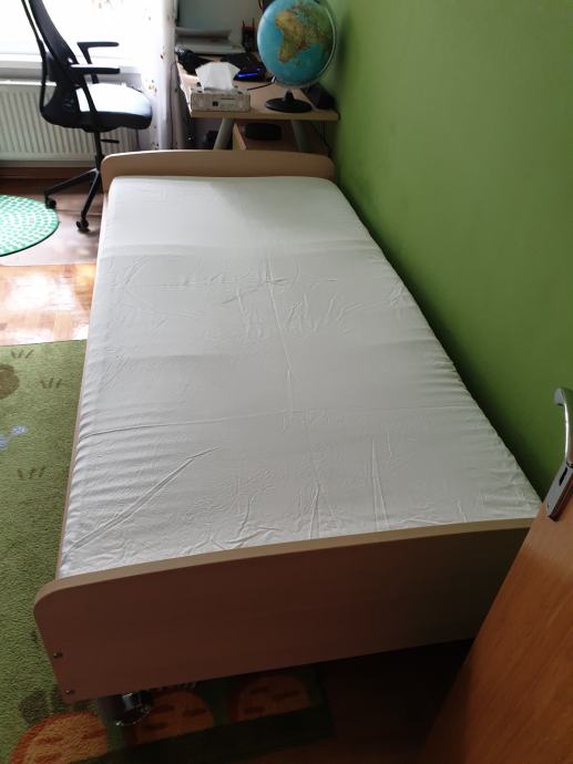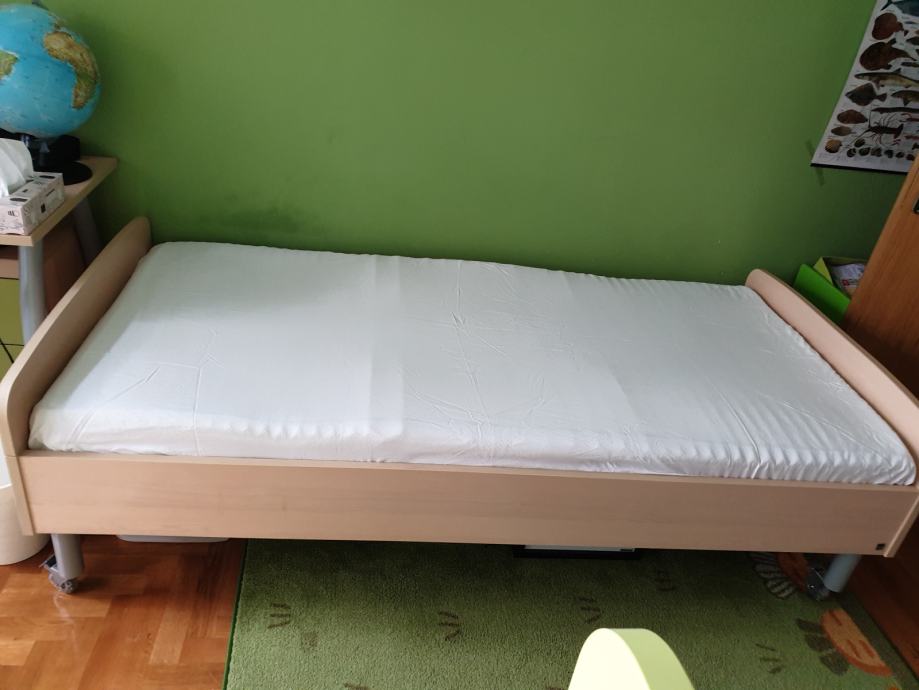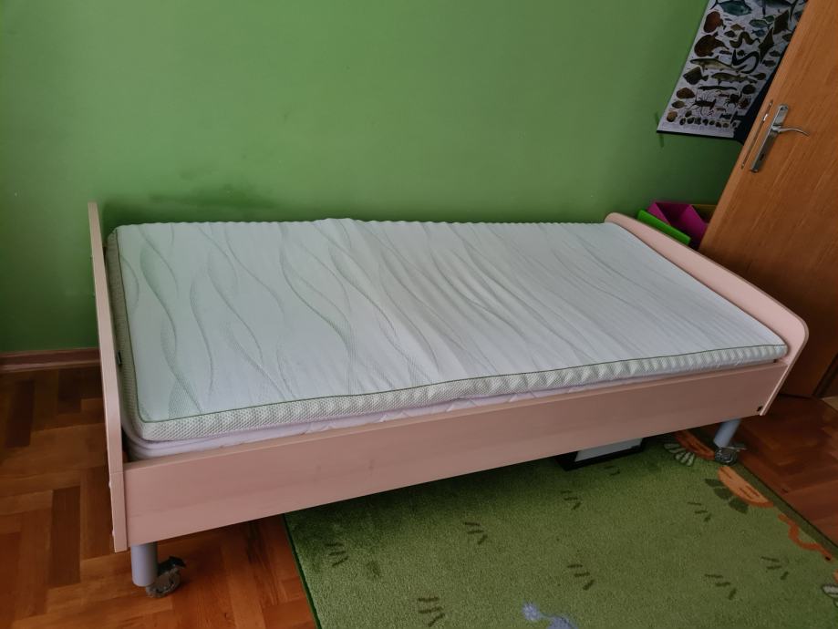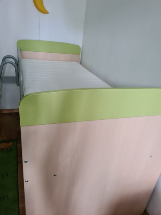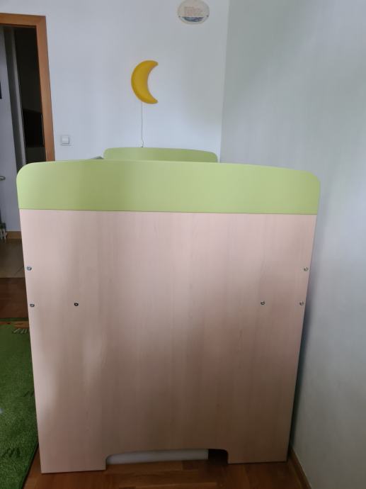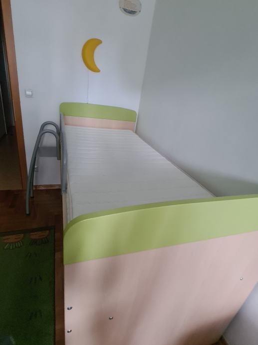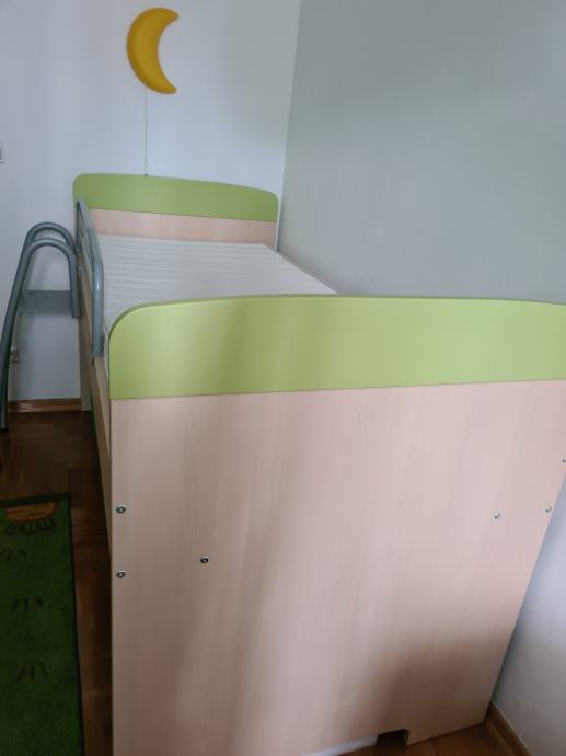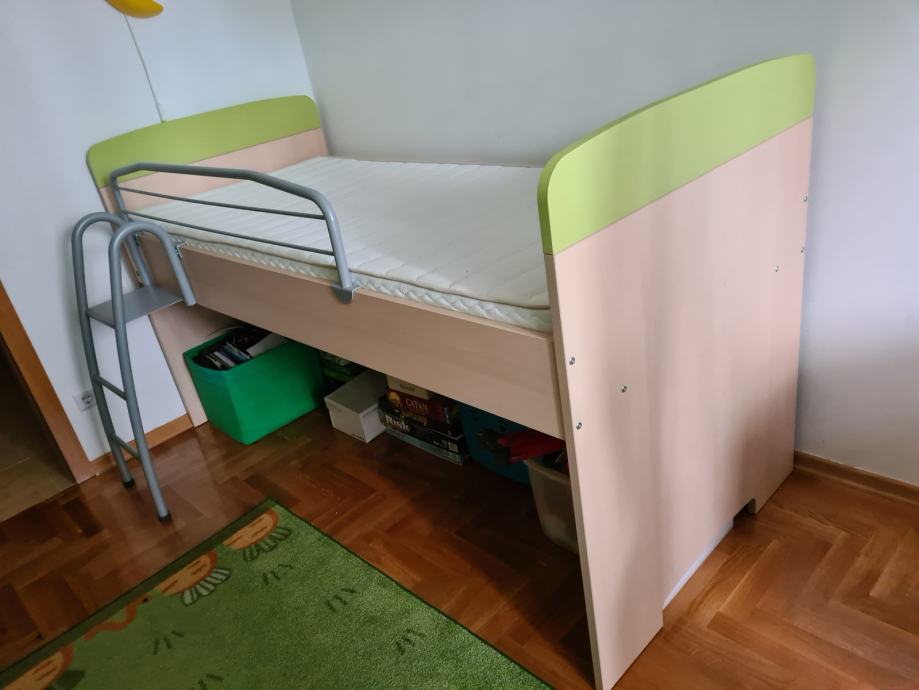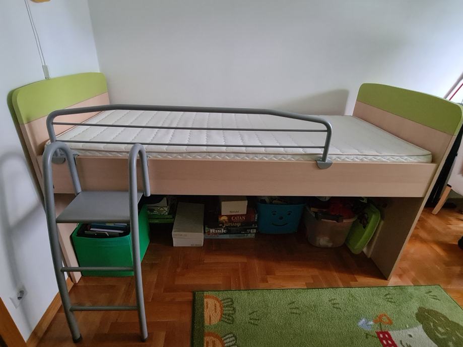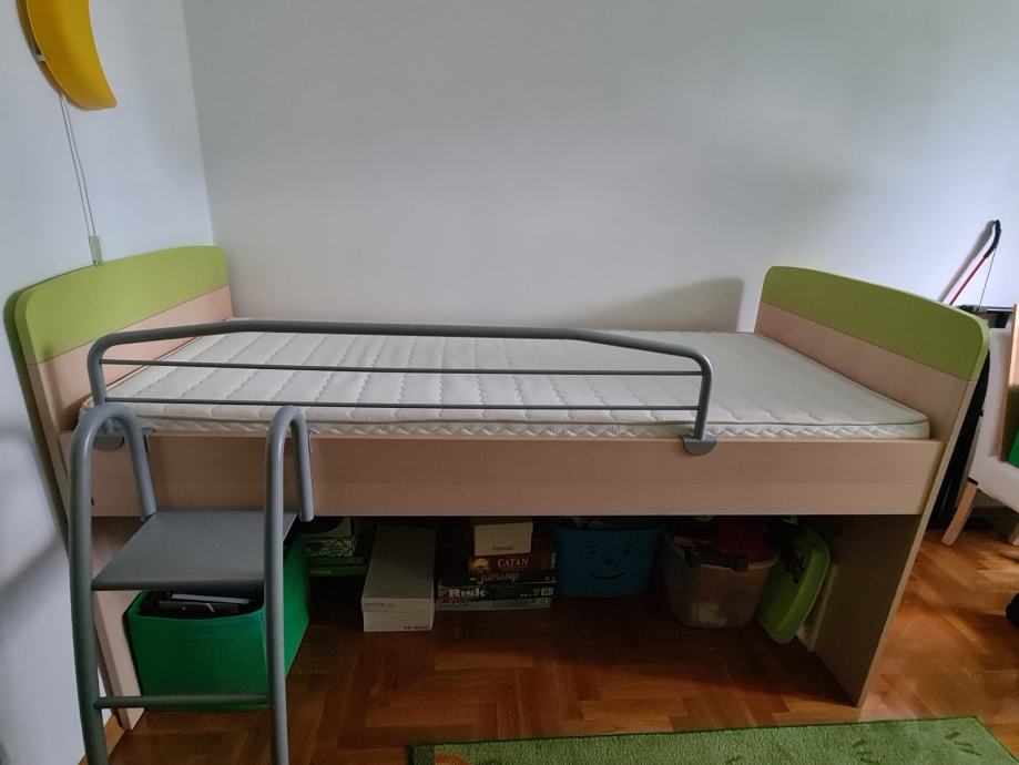 Alples zeleni krevet na kat 200x90 cm s metalnim ljestvama i pomoćnim krevetom na kotačima 190x80 cm. Obadva kreveta imaju madrac.