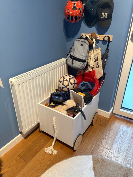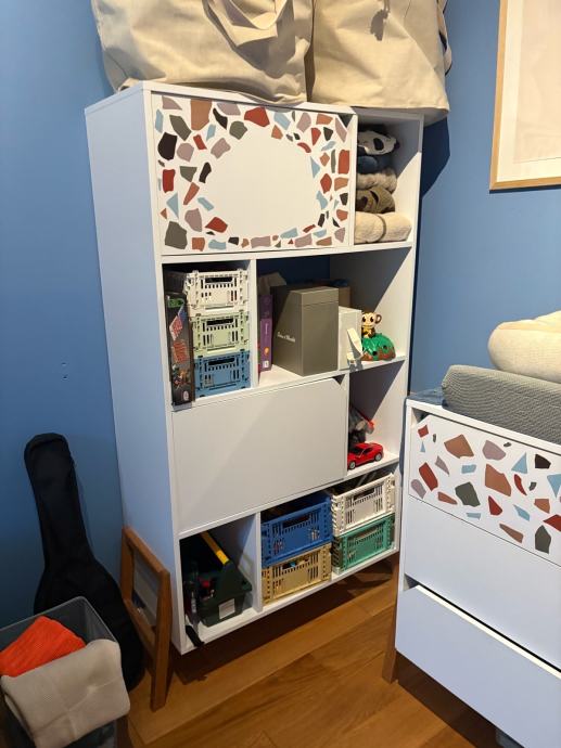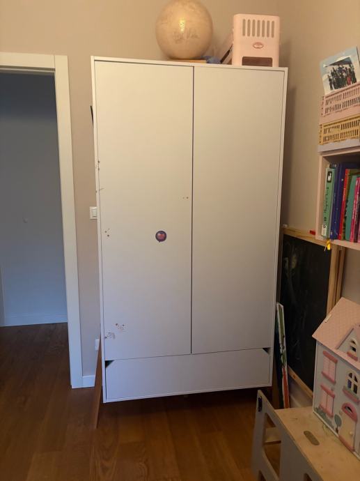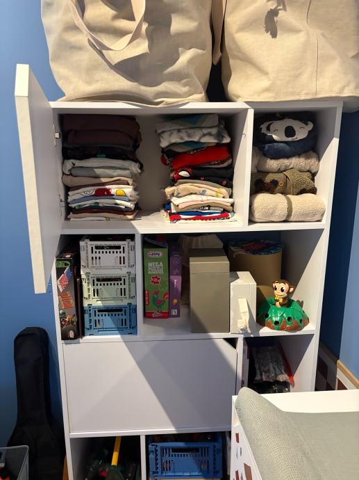 Kompletna dječja soba koja se sastoji od kreveta, ormara, regala, komode i kutije na kotače za pohranu igračaka.