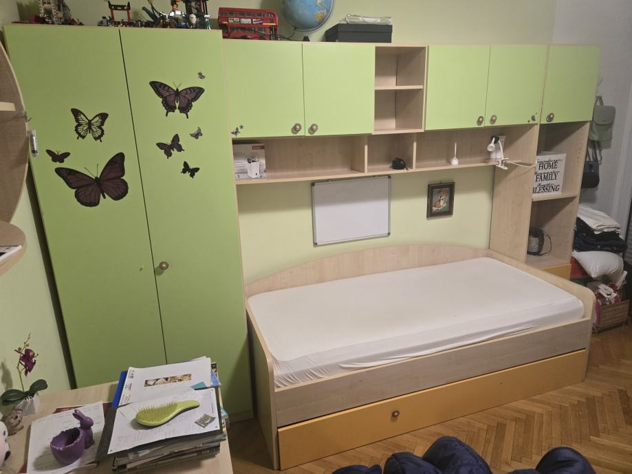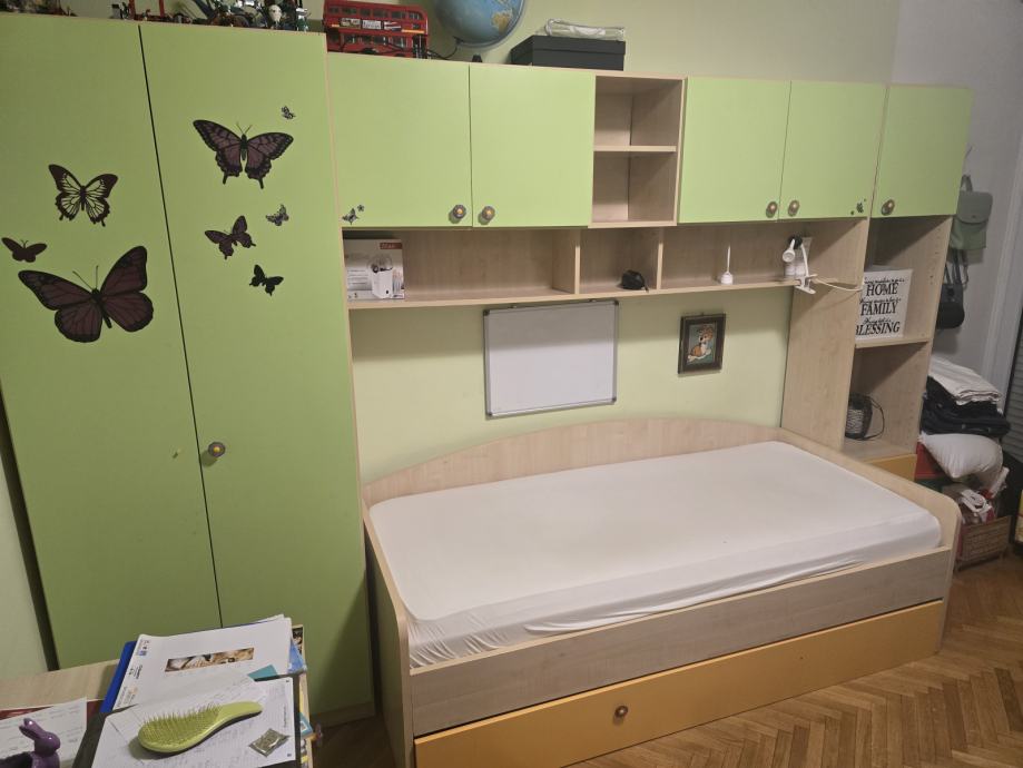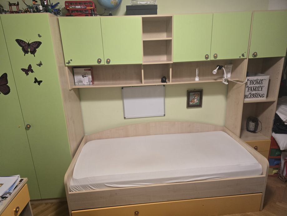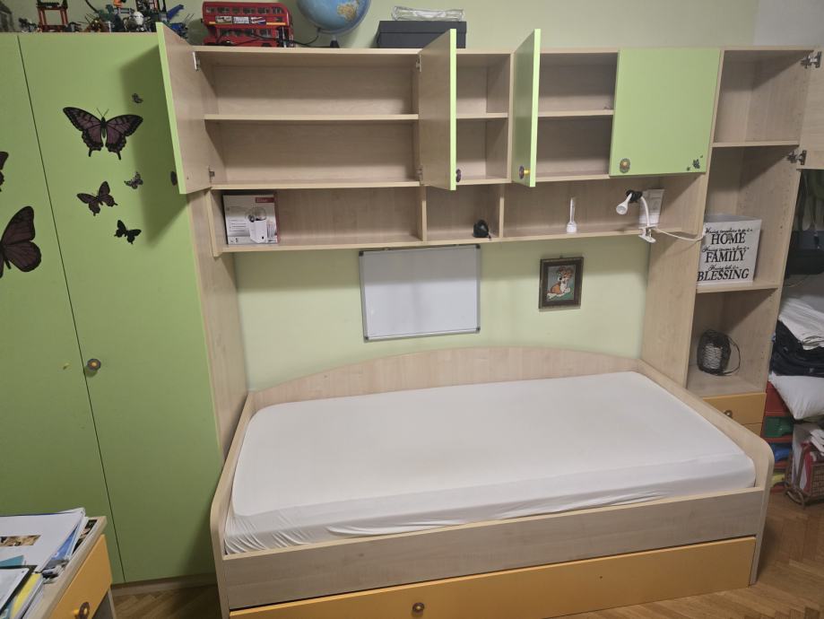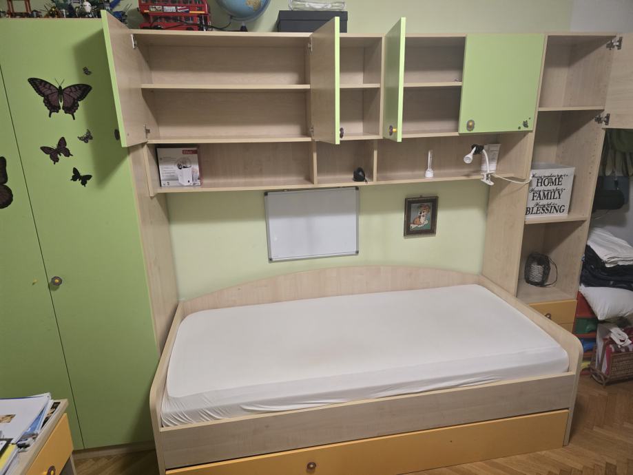 Dvokrilni ormar 90 cm, most i ormar 50 cm sa policama, te krevet 90×200cm. Krevet se prodaje bez podnice i madraca.