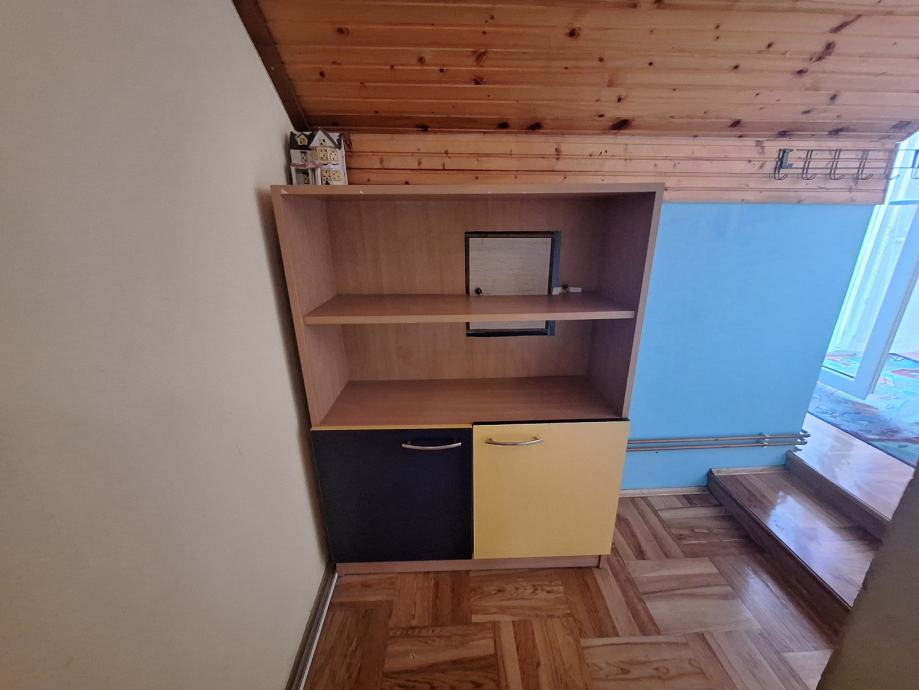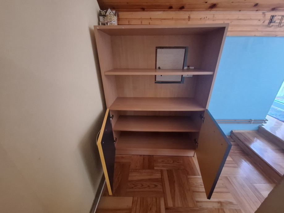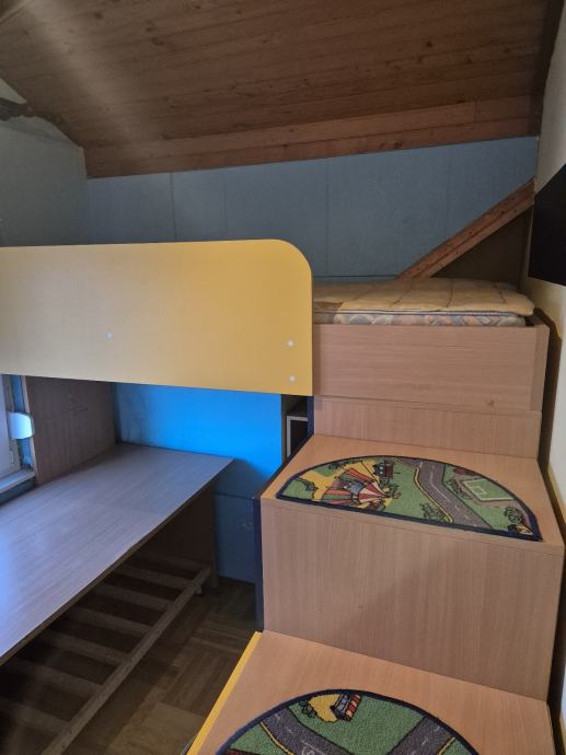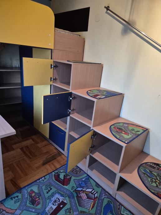 Prodajem komplet namještaja za dječju sobu. Set uključuje povišeni krevet na kat s drvenim stepenicama koje su ujedno i praktični element za odlaganje, s brojnim ormarićima i policama raspoređenim duž stepenica. Ispod kreveta nalazi se radni stol s dovoljno prostora za učenje ili igranje, a tu je i dodatni ormar za odjeću. Namještaj je izrađen u kombinaciji bukve i živopisnih boja, žute i plave, što mu daje veseli izgled tipičan za dječje sobe. Stepenice s ormarićima nude zaista puno prostora za pohranu igračaka, knjiga i ostalih stvari.