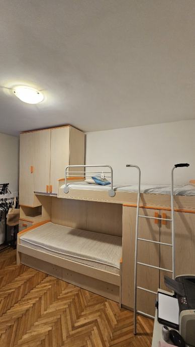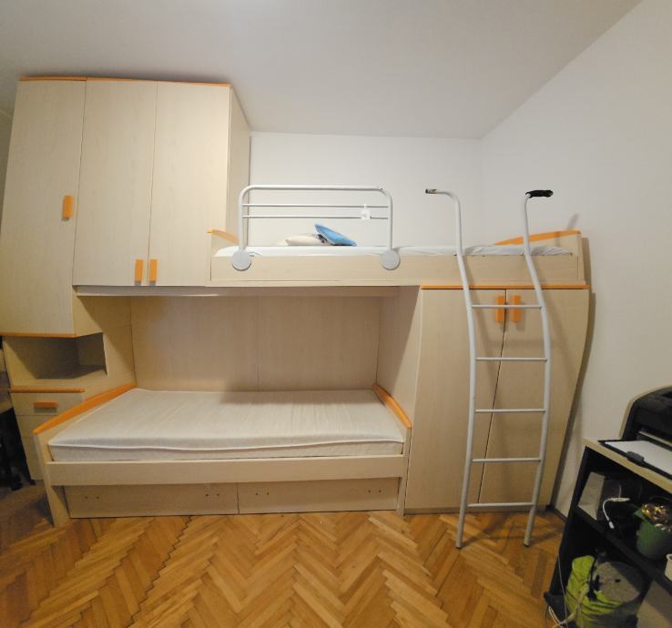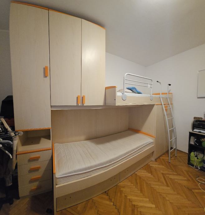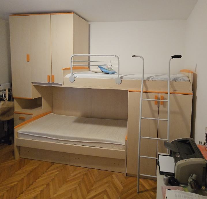 Očuvana djecja soba. Prodaje se u kompletu sa madracima i podnicama. Ispod kreveta su dvije velike ladice. Visina 265cm ( može se skratiti)