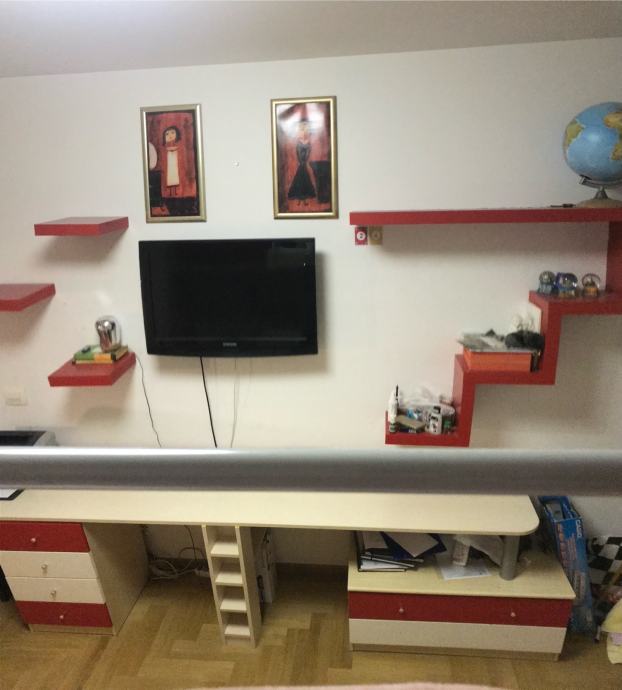 +police na zidu i police za knjige uz produzetak ormara (lijevo od radnog stola koje je kod prozora) te dodatne ladice ukomponirane u produzetak veceg radnog stola. Kontakt ; 097 7094 524