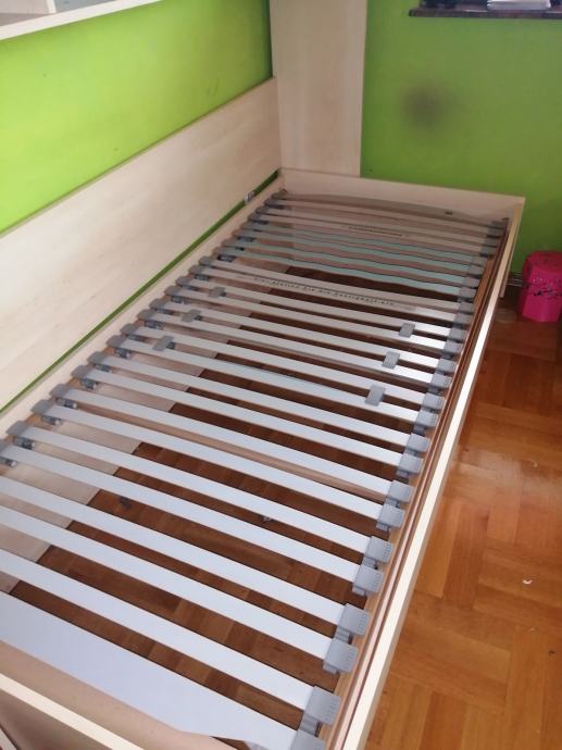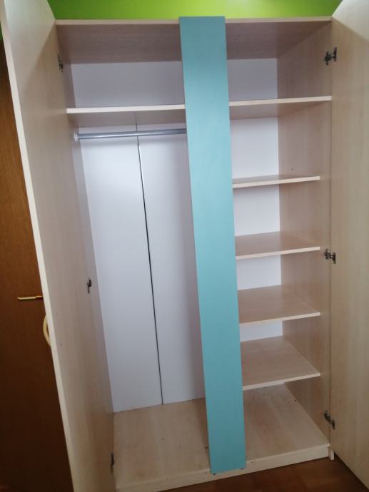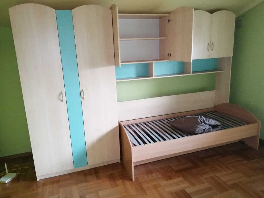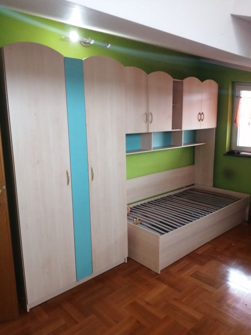 Jako dobro očuvane dvije dječje sobe, bez madraca, most, dvokrilni ormar, krevet sa podnicom 90×200 cm sa ladicom ispod, radni stol. Dužina tri metra.