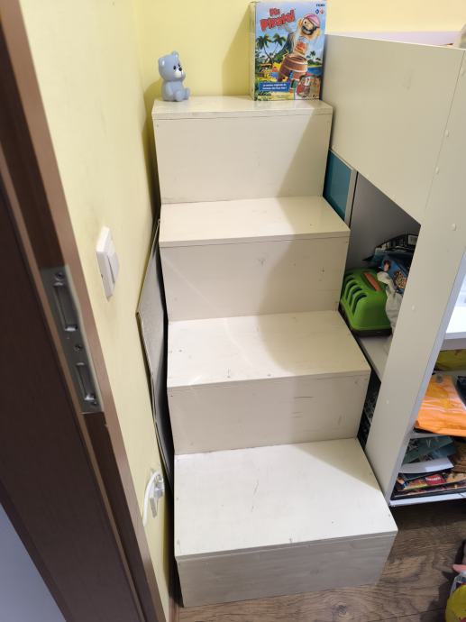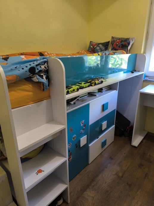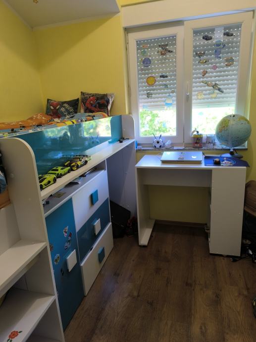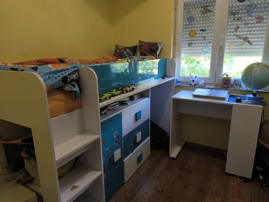 Prodaje se dječja soba sa krevetom na kat i radnim stolom te dodatnim stepenicama. Ima jako puno prostora za odlaganje stvari.Veličina ležaja 90x200.