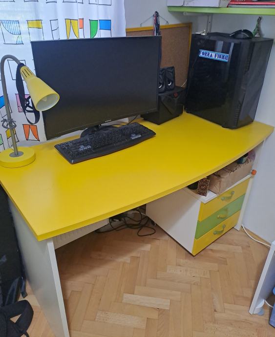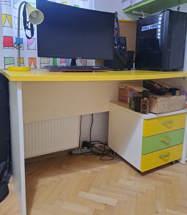 Radni stol + ladičar na kotačima , krevet na izvlačenje + 2 podnice, ormar, četiri zidne police