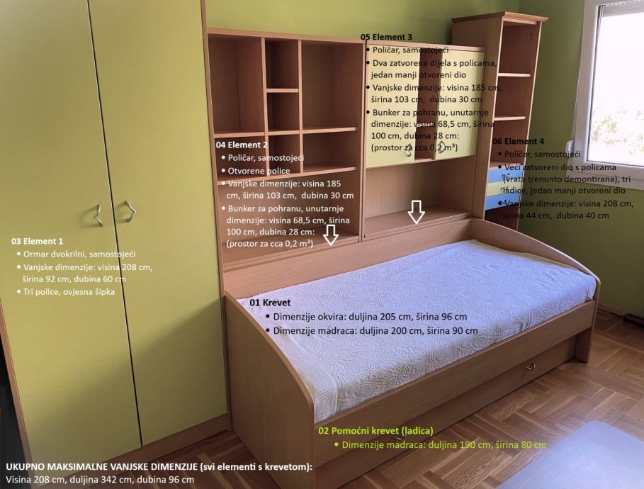 UKUPNO MAKISMALNE VANJSKE DIMENZIJE (svi elementi s krevetom):