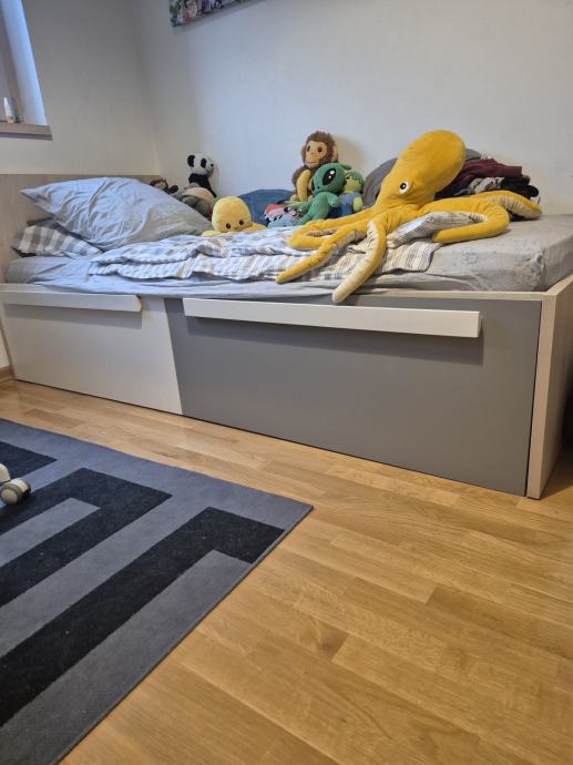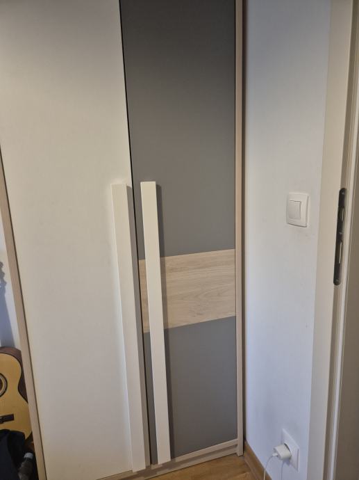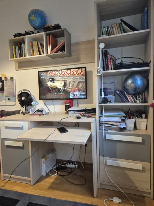 Prodaje se dječja soba, kupljena u Emmezeti, a sastoji se od: ormara (80x55x200), kreveta sa dva ladičara (97x200), regal za knjige s dvije ladice (54x198x40), radni stol (119x55) i zidna polica za knjige (š 137 cm). Soba je korištena, u dobrom stanju, jedino jedna fronta od ladičara na krevetu otpada.