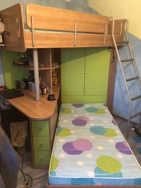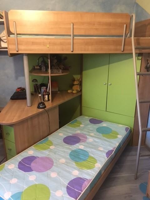 Soba sadrži visoki krevet sa ljestvama, radni stol sa ladicama, ormar i doljnji krevet.