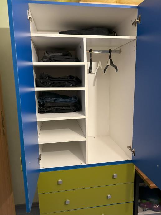 ormar je izrađen po mjeri. U njemu je odjel sa policama i odvojeni dio za viseću robu te ladice.
