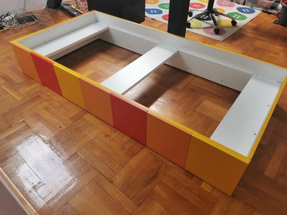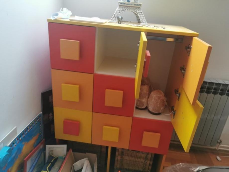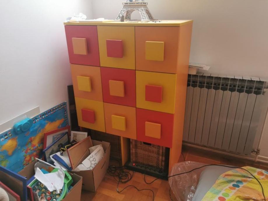 Prodajem dječji krevet i ormar u živahnim bojama - narančastoj, žutoj, crvenoj s ukrasnim kvadratima.