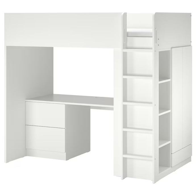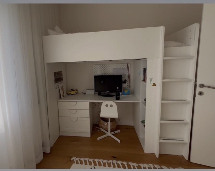 Ikea povišen krevet, bijeli s okvirom/sa stolom, ormarom, madracom i radnom stolicom