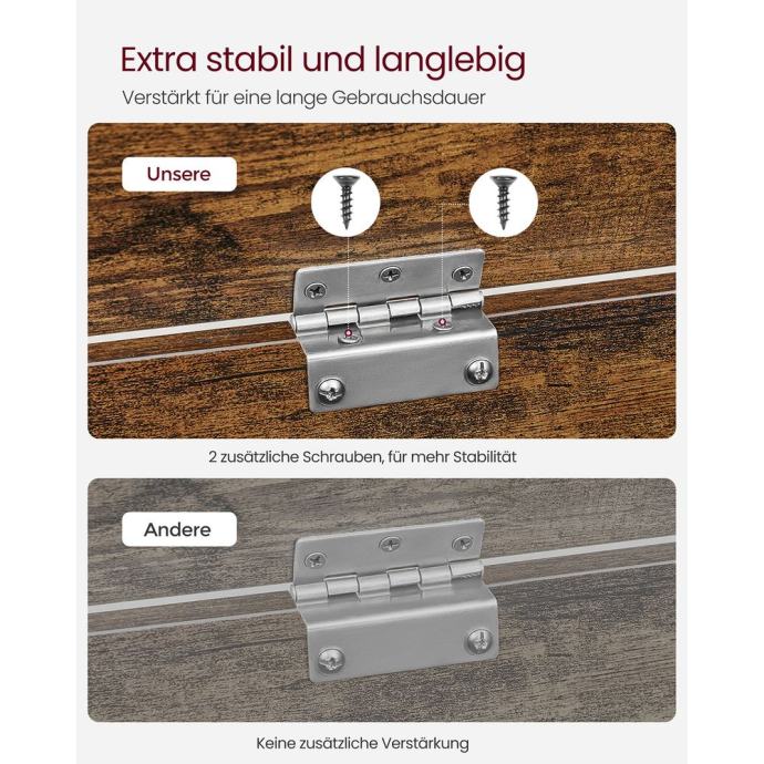Ova velika škrinja izrađena je od robusnih MDF ploča i može izdržati do 180 kg. Sigurnosne šarke također sprječavaju naglo zatvaranje poklopca, čime štite vaše ruke i prste vaše djece.