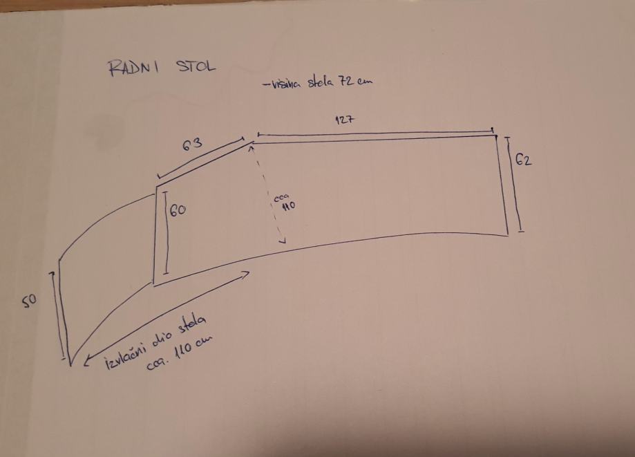 Dimanzije radnog stola na slici. Izvlačni dio stola vidljiv na slikama.