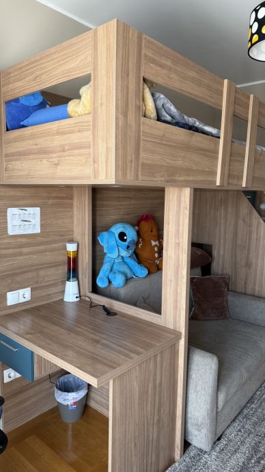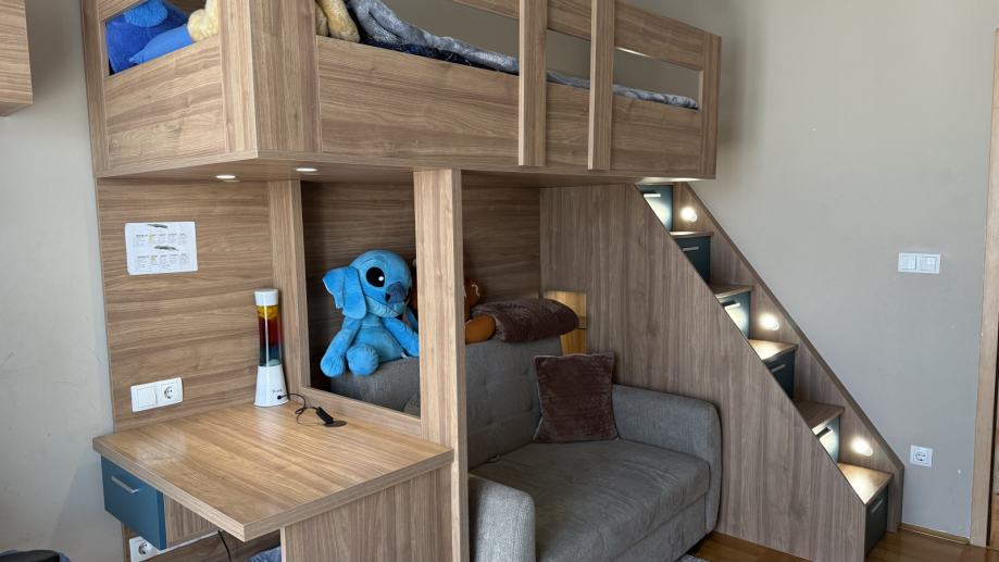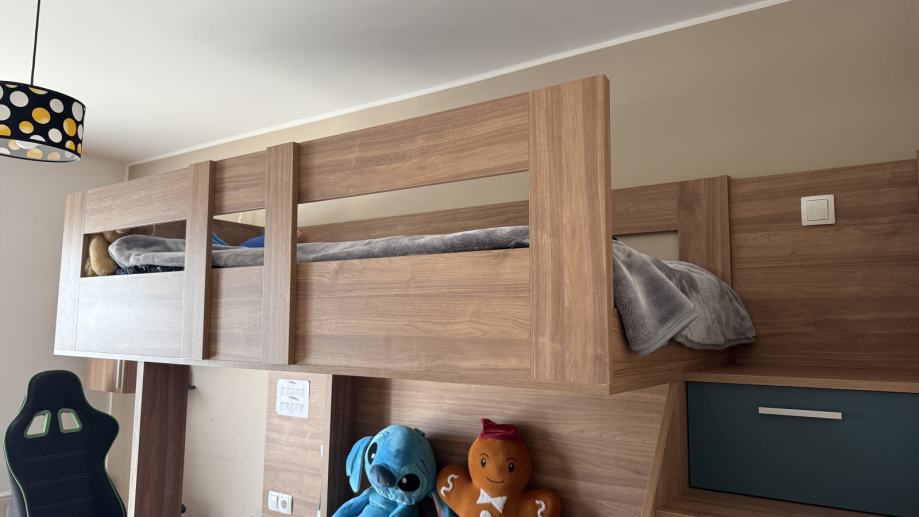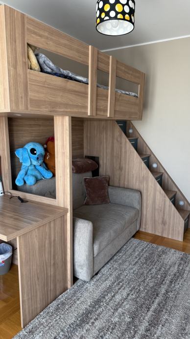 Prodajem dječju sobu staru 4 godine, ručni rad, kvalitetna i očuvana. Soba se sastoji od kreveta na kat, radnog stola i stepenica sa 6 ladica. Uz sobu poklanjam i madrac za krevet. U cijenu nije uključna demontaža sobe (trebao bi ju odraditi majstor koji je sobu sastavljao uz naknadu). Uz sobu, prodajem i dvosjed sa slike koji se može izvući u pomoćni krevet. Cijena sobe je 1.100 €. Cijena dvosjeda je 200€. Ako uzimate sve zajedno, cijena je 1.200 €.