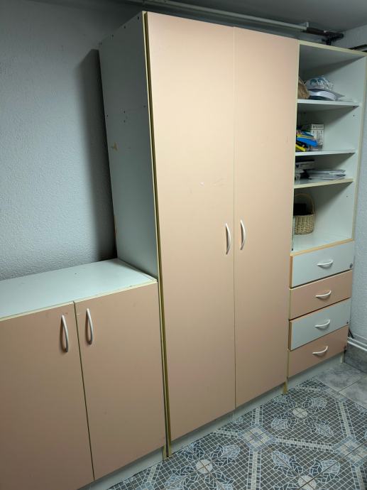 Prodajem komplet namještaja za dječju sobu u bež/krem boji. Set se sastoji od visokog ormara s dvoja vrata, niskog ormarića s dvoja vrata te regala s otvorenim policama i četiri ladice. Namještaj je svijetle boje s bijelim detaljima, kompaktnih dimenzija, prikladan za manji prostor.