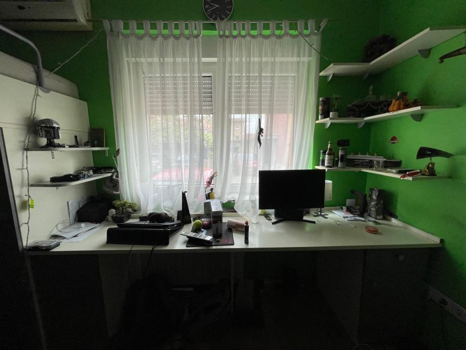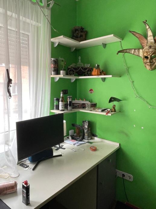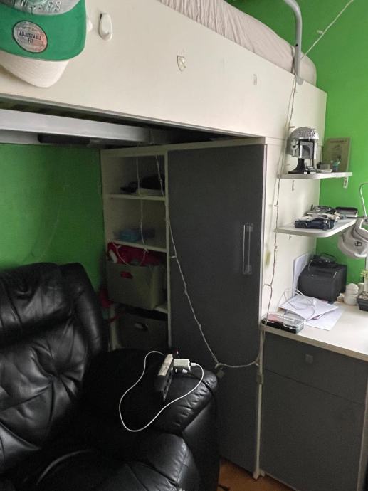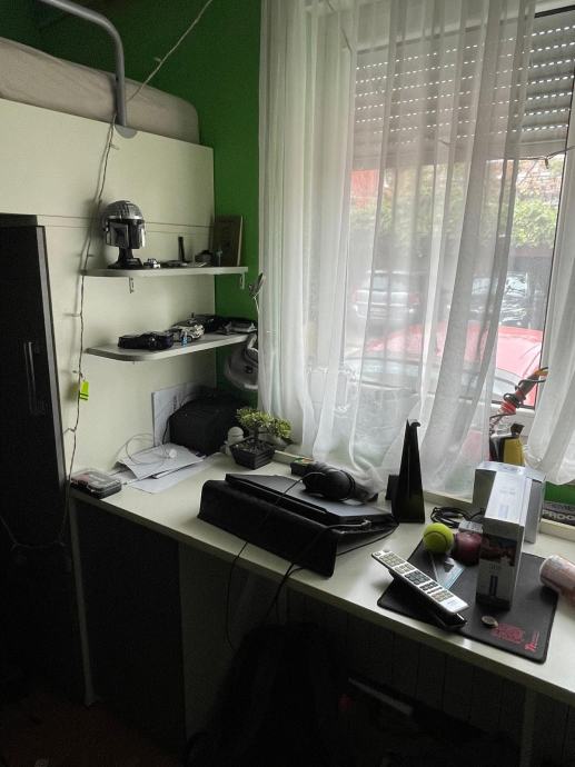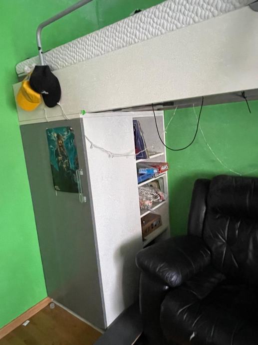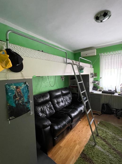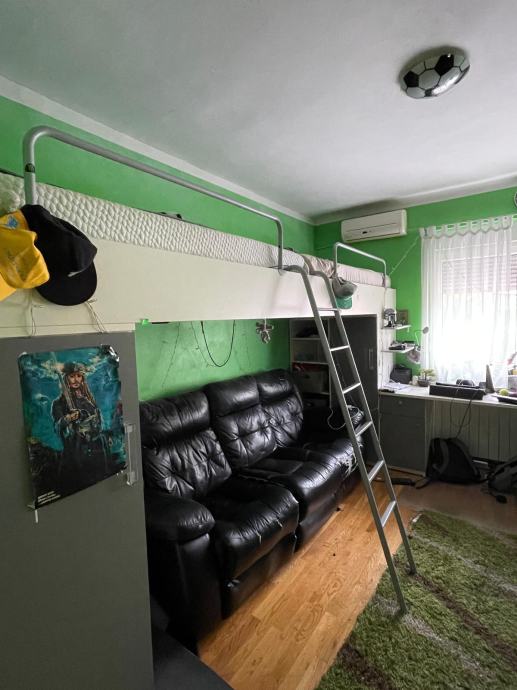 Soba za dvoje djece, rađena po mjeri. Dužina oba kreveta 390cm. Soba je sastavljena i rastavlja se uz prisutnost kupca kako bi znao ponovo sastaviti. Soba se sastoji od dva nosiva ormara (ispod kreveta) tri kvadratne metalne cijevi na ormarima koje čine most, dva okvira kreveta, dvije podnice, dva visoka madraca, trosjeda od umjetne kože (bočna sjedeća mjesta s podizanjem za noge, koža je oštećena), dugačkog radnog stola za dvoje djece s dva radna ormarića, police. Soba je rađena po narudžbi, rabljena ali u jako dobrom stanju. Napravljena je da djeca imaju spavaću dio, ali i dnevni. Soba je u Zagrebu-zapadni dio.