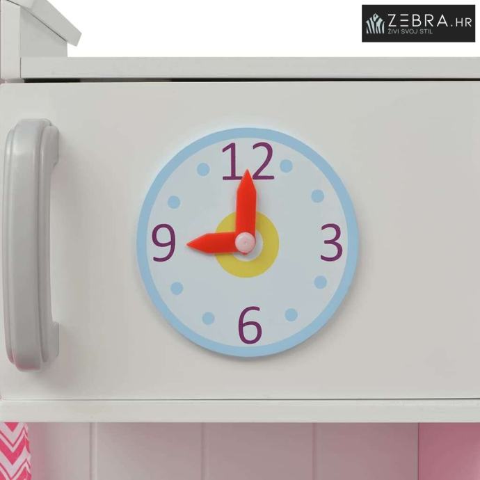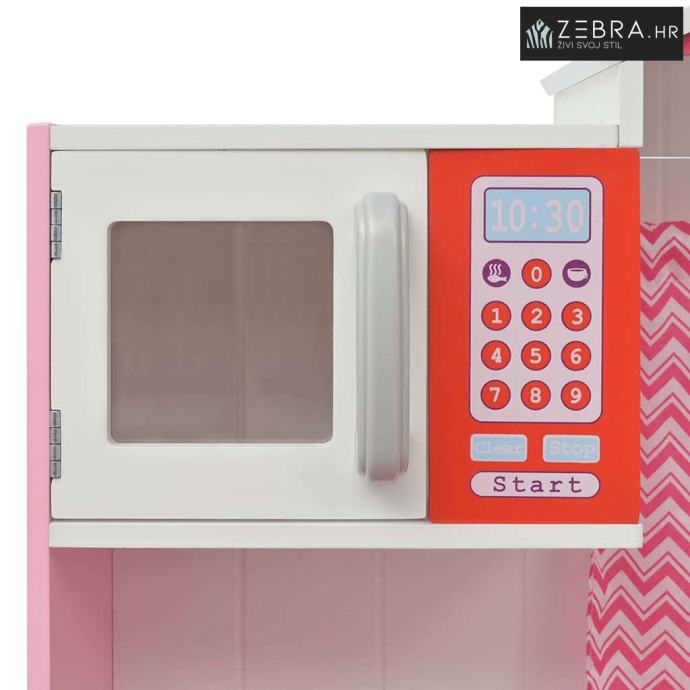 Ova ljupka i jednostavna za sastavljanje kuhinja za igranje, izrađena je od MDF-a i borovog drveta i lijepo je dizajnirana. Prozori sa zavjesama, živim bojama i tradicionalnim izgledom,čine kuhinju baš kao da je stvarna. Ima slavinu sa sudoperom i gumbima za pećnicu sa zvučnim klikom, što će iskustvo kuhanja učiniti realističnim. Štednjaci imaju 2 rotirajuće ručice koje omogućuju vašem malom kuharu da prilagodi temperaturu. Dva prostrana ormarića i polica s dvije razine, pružaju dovoljno prostora za pohranu. Sat s pokretnim kazaljkama, ukrašava vrata gornjeg ormarića kao i pećnica s dva odjeljka, a mikrovalna pećnica je osobiti dodatak.