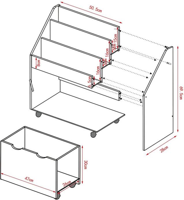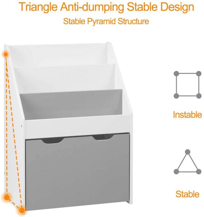 Ova dječja polica za knjige s kotačićima idealna je za organizaciju knjiga, igračaka i ostalih dječjih stvari. Stepenasti dizajn s 3 razine omogućuje djeci da odmah vide i samostalno odaberu željenu knjigu te je nakon čitanja lako vrate na mjesto.