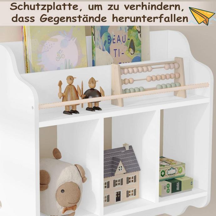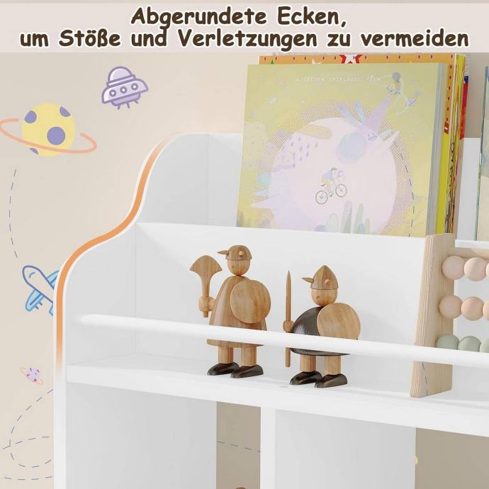Svi rubovi i kutovi su zaobljeni kako bi se spriječile ozljede. Gornja polica ima dodatnu zaštitnu letvicu koja sprječava ispadanje knjiga, što djeci omogućuje sigurno i samostalno korištenje.