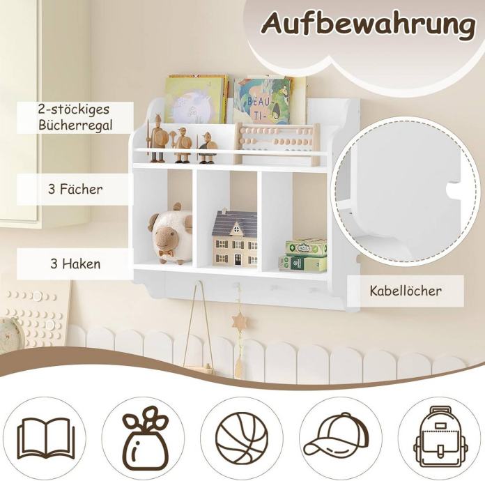 Ova dječja zidna polica nudi višenamjenski prostor za pohranu i organizaciju knjiga, igračaka i dodataka. Gornji dio omogućuje slaganje knjiga u dva reda, dok se u tri otvorena pretinca mogu izložiti igračke, figurice ili dekoracije. Četiri kukice idealne su za vješanje školskih torbi, šalova, kapa ili ključeva. Bočni otvori za kablove omogućuju jednostavno provođenje žica, npr. za radio ili noćnu lampu.