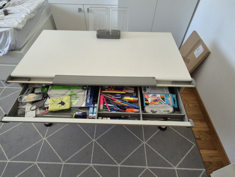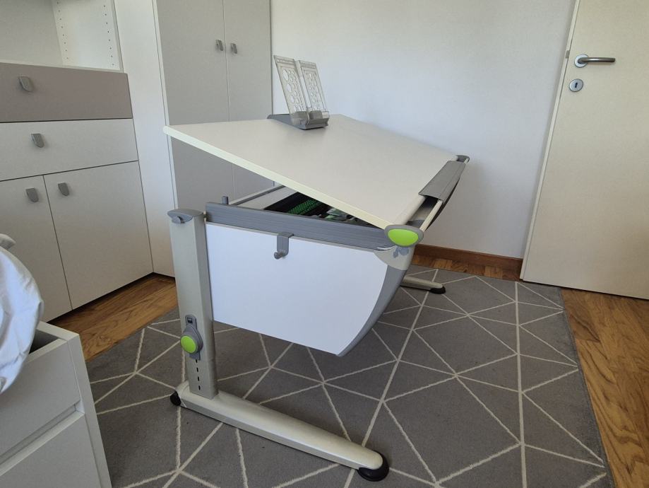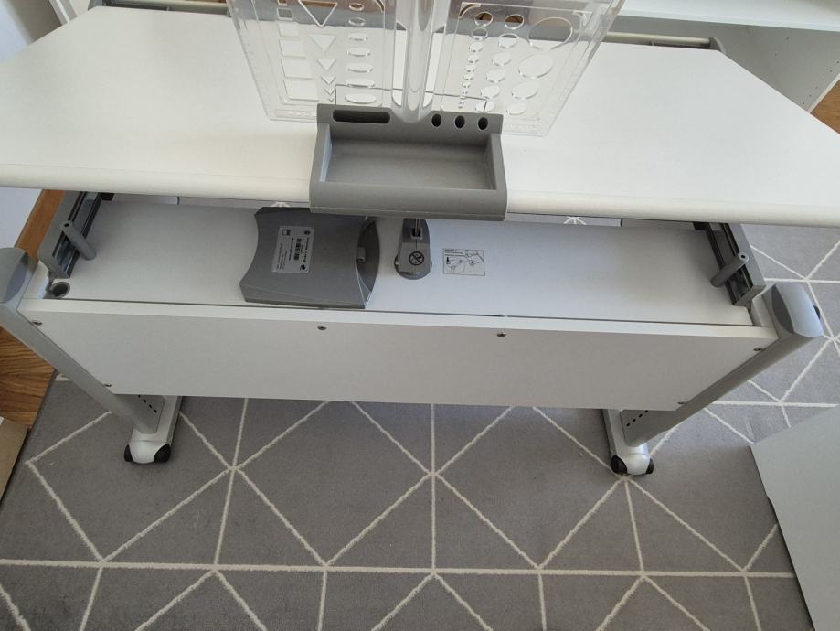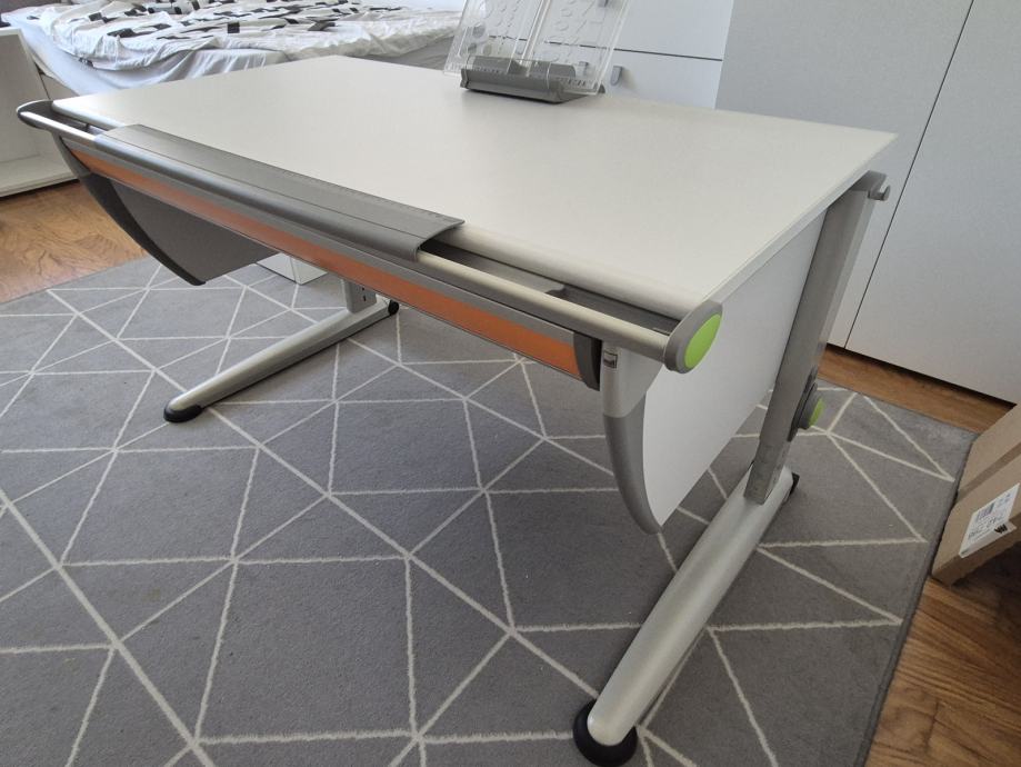 Radni stol njemačke marke Moll. Stol je podesiv po visini, ergonomski podesiv, može se nagnuti pod određenim kutem. Boja stola je promjenjiva (narančasta, roza, plava...)