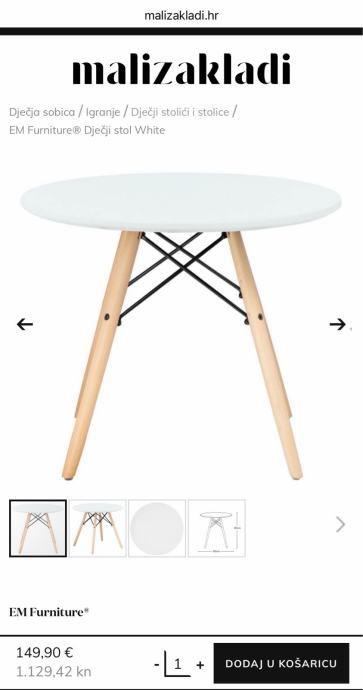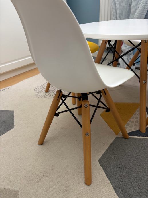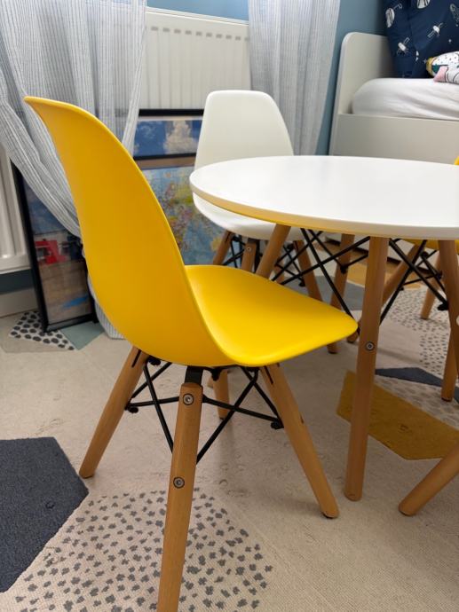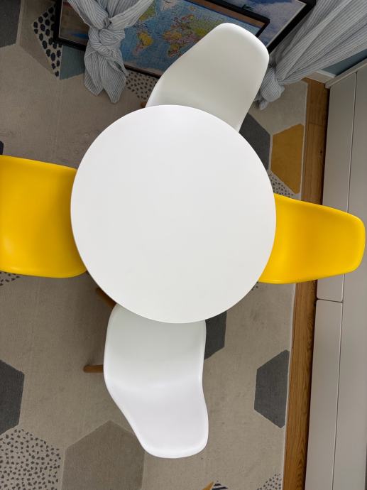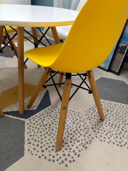 Djecji stol marke EM furniture promjera 60cm s 2 bijele i dvije zute stolice. Bez ostecenja, lijepo i moderno za djecju sobu.