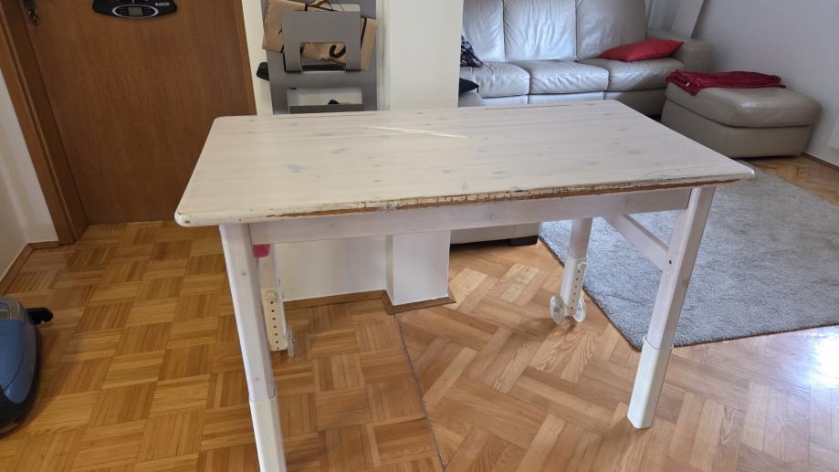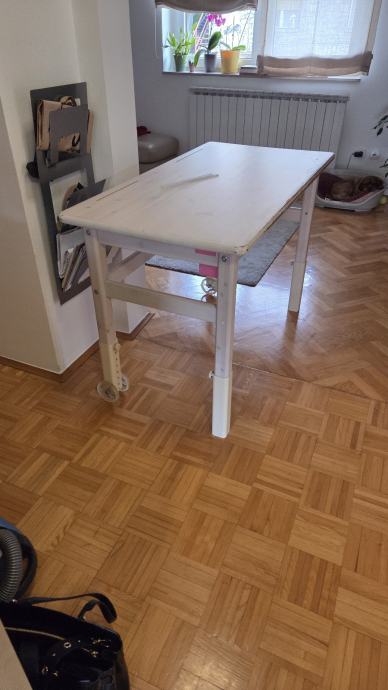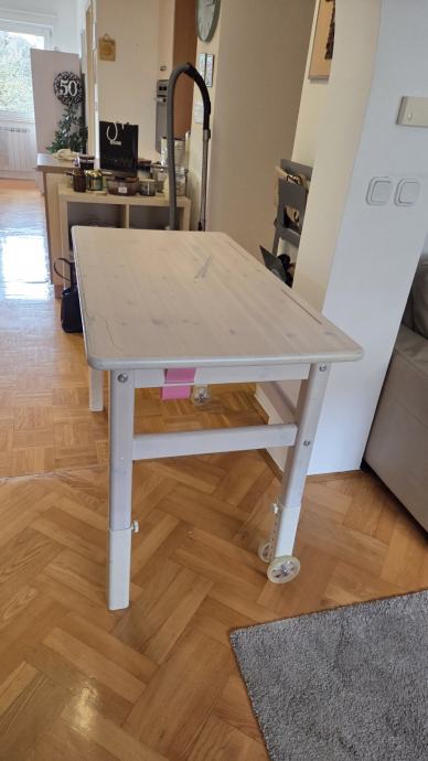 Prodajem Flexa dječji radni stol u bijeloj boji, izrađen od masivnog drva. Stol ima podesive noge koje omogućuju prilagodbu visine, a na nogama se nalaze kotačići za lakše premještanje. Solidne je konstrukcije i pruža dovoljno radne površine za crtanje, pisanje ili učenje.radni stol s pokretnom radnom pločom, prilagodljivim nogama i kotačima.
