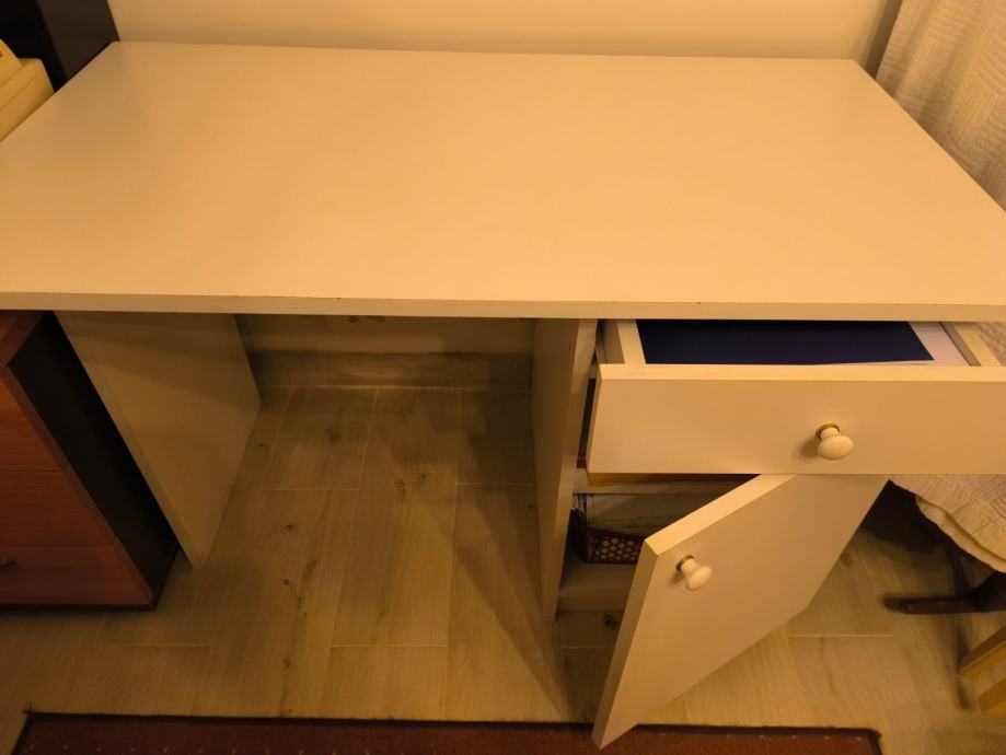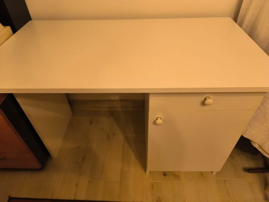 Bijeli pisaći stol u dobrom stanju. Dimenzije: 110x60 cm/ visina 73 cm. Ima ladicu i ormarić s policom. Napomena radi prijevoza: Stol je kupljen u ovakvom stanju i ne može se rastaviti.