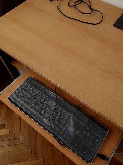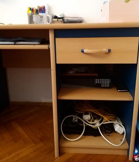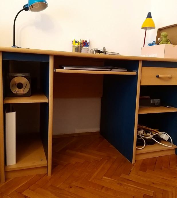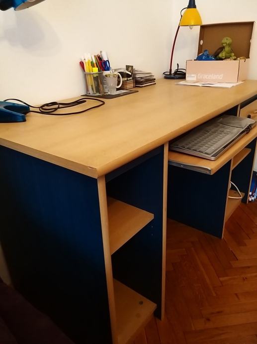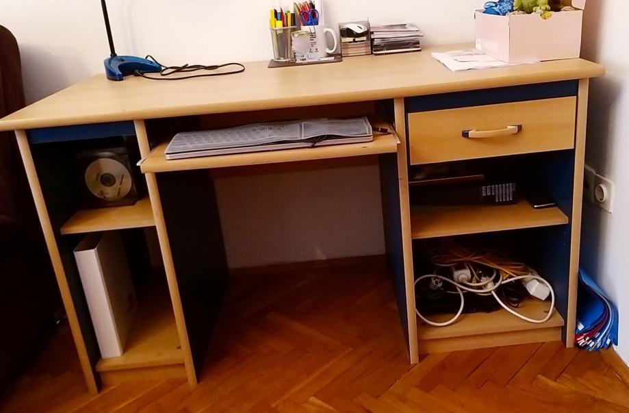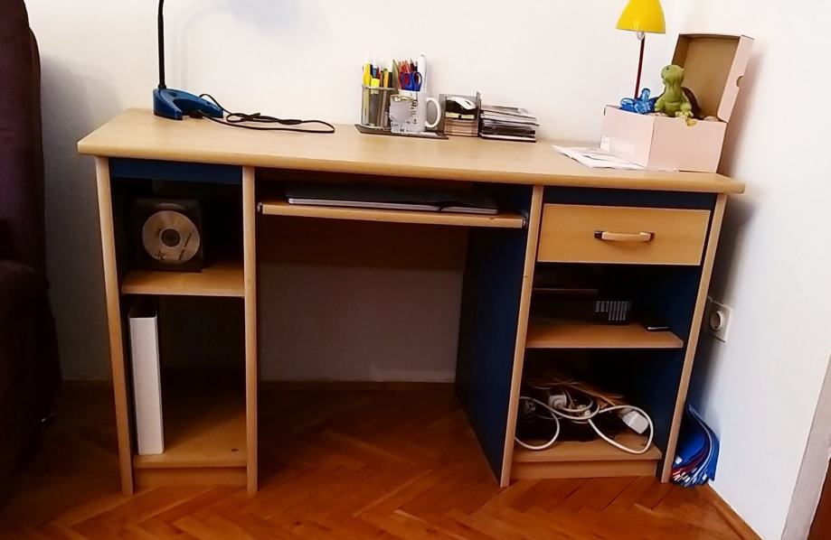 Radni stol, boja bukve s plavim. Dimenzije: 134 cm dužina, 64 cm širina, 75 cm visina. Ima jednu ladicu s ručkom.