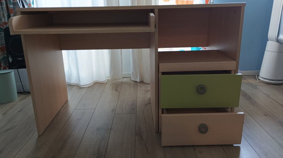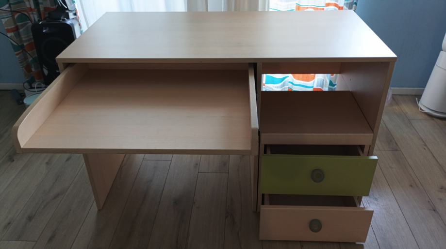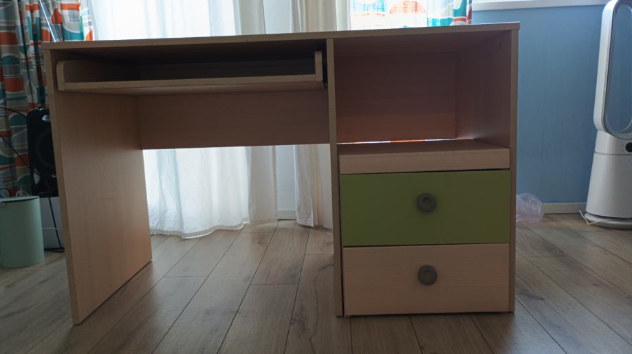 Kvalitetan radi stol za dijete,sa prostranom ladicom i odvojenom komodom sa dvije duboke ladice.Dimenzije v76,š120,d60.Stol nema vidljivih oštećenja.