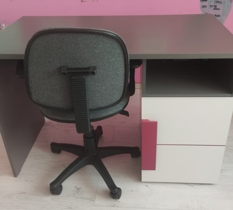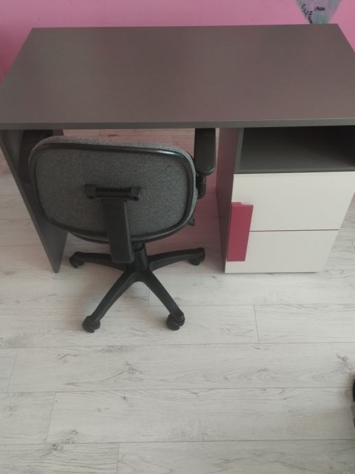 Cijena je za sve zajedno za stol i stolicu. Stol je jako očuvani, kao novi, sivo bijeli ,dimenzije stola 60x110 cm. Stol može biti i dječji i radni stol za odraslu osobu..Stolica se može okretati.