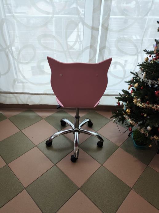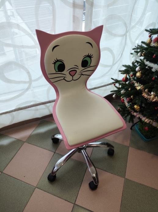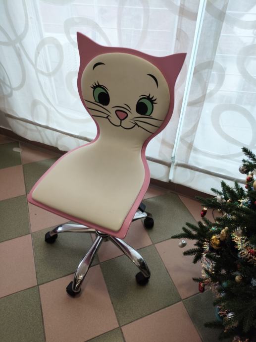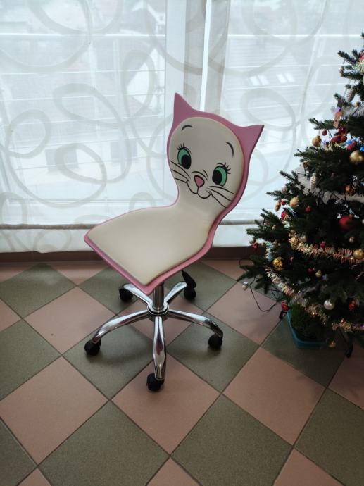 Na kotače je, ima dobru mobilnost i podesivu visinu. Gornji dio je od drva i ima mekanu podlogu za sjedenje, a donji dio je od nehrđajućeg metala. Na sebi ima print mačjeg lica, specifično od Marie iz Mačaka iz visokog društva. Ima par kozmetičkih oštećenja (npr. boja se na nekim mjestima odvojila od drveta), ali osim toga je dobro očuvana.