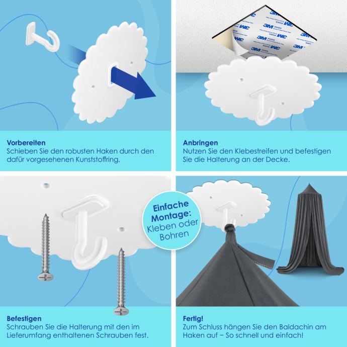 S našim baldahinom za krevet možete stvoriti ugodnu atmosferu u kojoj će vaše dijete zaspati ili ugodan kutak za utočište . Nadstrešnica odaje sigurnost i sigurnost . Zahvaljujući priboru za montažu i uputama, krevet s baldahinom možete postaviti bilo gdje u sobi . Zahvaljujući jednostavnoj i nekompliciranoj montaži, nadstrešnica je spremna za korištenje u samo nekoliko koraka . Da biste to učinili, pričvrstite kuku na plastični prsten - zatim pričvrstite ljepljive trake na plastični prsten i pričvrstite držač na strop . Pričvrstite nosač na mjesto pomoću vijaka uključenih u isporuku . Na kraju , jednostavno objesite baldahin na kuku - tako jednostavno ! Zbog širine od 4 metra i visine od 2,7 metara , naš krevet s baldahinom nije prikladan samo za djecu već i za odrasle . Zahvaljujući veličini možete uživati u lijepom obiteljskom vremenu . Napravljen od 100% visokokvalitetnog poliestera , baldahin možete jednostavno prati u perilici rublja na 30°C - jednostavno uklonite metalni prsten i spremni ste za rad . Prilikom odabira prstena pazili smo da se zavjesa za krevet savršeno otvori na sve strane i da nema udubljenja i udubljenja