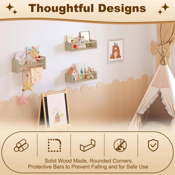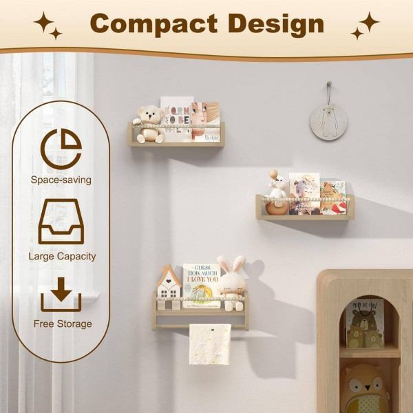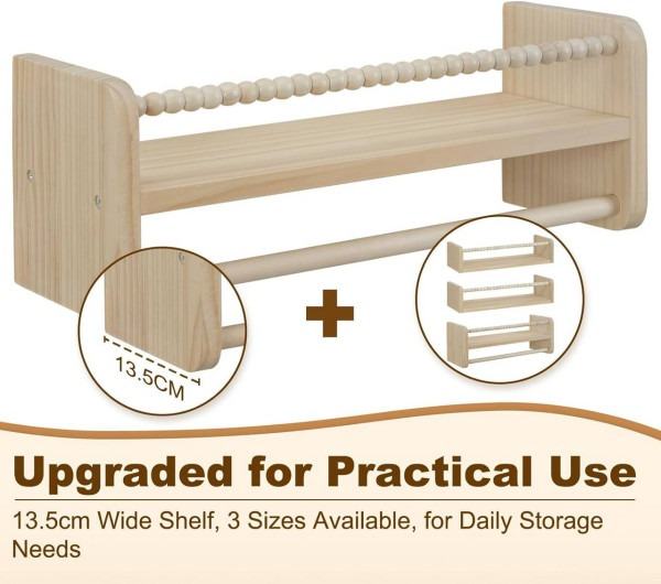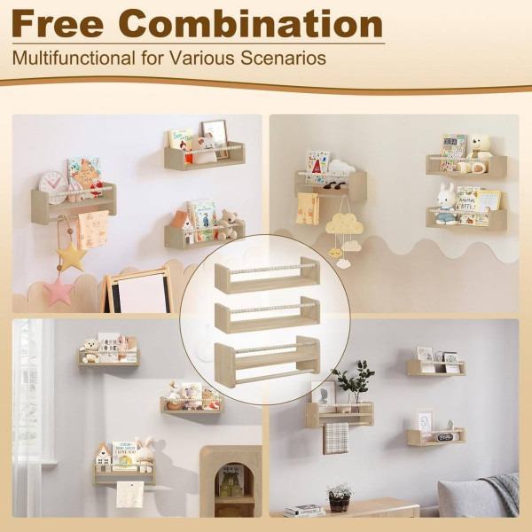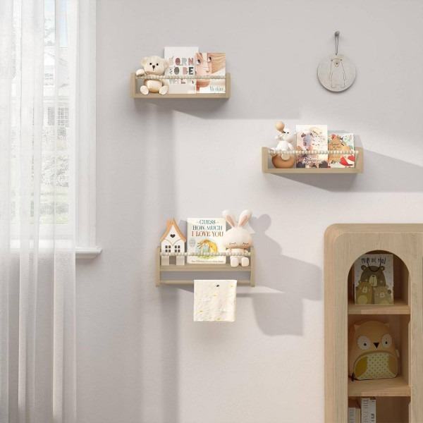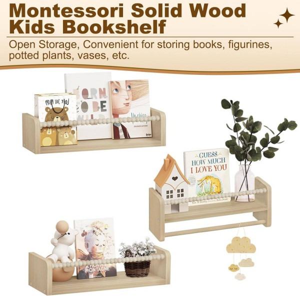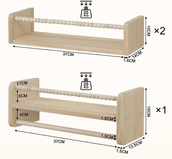 Ovaj set dječjih zidnih polica sastoji se od 3 police izrađene od punog drva koje se mogu pričvrstiti okomito ili vodoravno jedna do druge ili zasebno na zid. Jedan od njih opremljen je šipkom za vješanje kako bi se povećao prostor za pohranu, čime se štedi prostor i optimalno koristi zidni prostor. Zidna polica za djecu može se fleksibilno montirati na visinu koja je lako dostupna djeci, tako da mogu lako ukloniti i vratiti svoje igračke ili materijal za čitanje. Osim toga, kutovi su zaobljeni, a svaka polica ima traku s perlama kao zaštitu od pada, što može pobuditi zanimanje djece. Izrađena od čvrstog i izdržljivog punog drva, dječja polica za knjige ima otvoreni dizajn i istovremeno je rješenje za pohranu i lijep ukras. Dubina od 14 cm omogućuje vašoj djeci da lako postave knjige, male biljke u saksiji, igračke, figure i lutke. Plutajuća polica je kompaktnog oblika, ali praktična za korištenje. Ima 3 opcije veličine i pogodan je za dječju sobu, spavaću sobu, dnevni boravak, kuhinju, dječju sobu, vrtić itd. Komplet od 3 male drvene police može se jednostavno pričvrstiti na zid pomoću priloženih tipli. Uživajte u sretnim trenucima sa svojom djecom! Za sve informacije nazovite na broj telefona 092/399-75-19